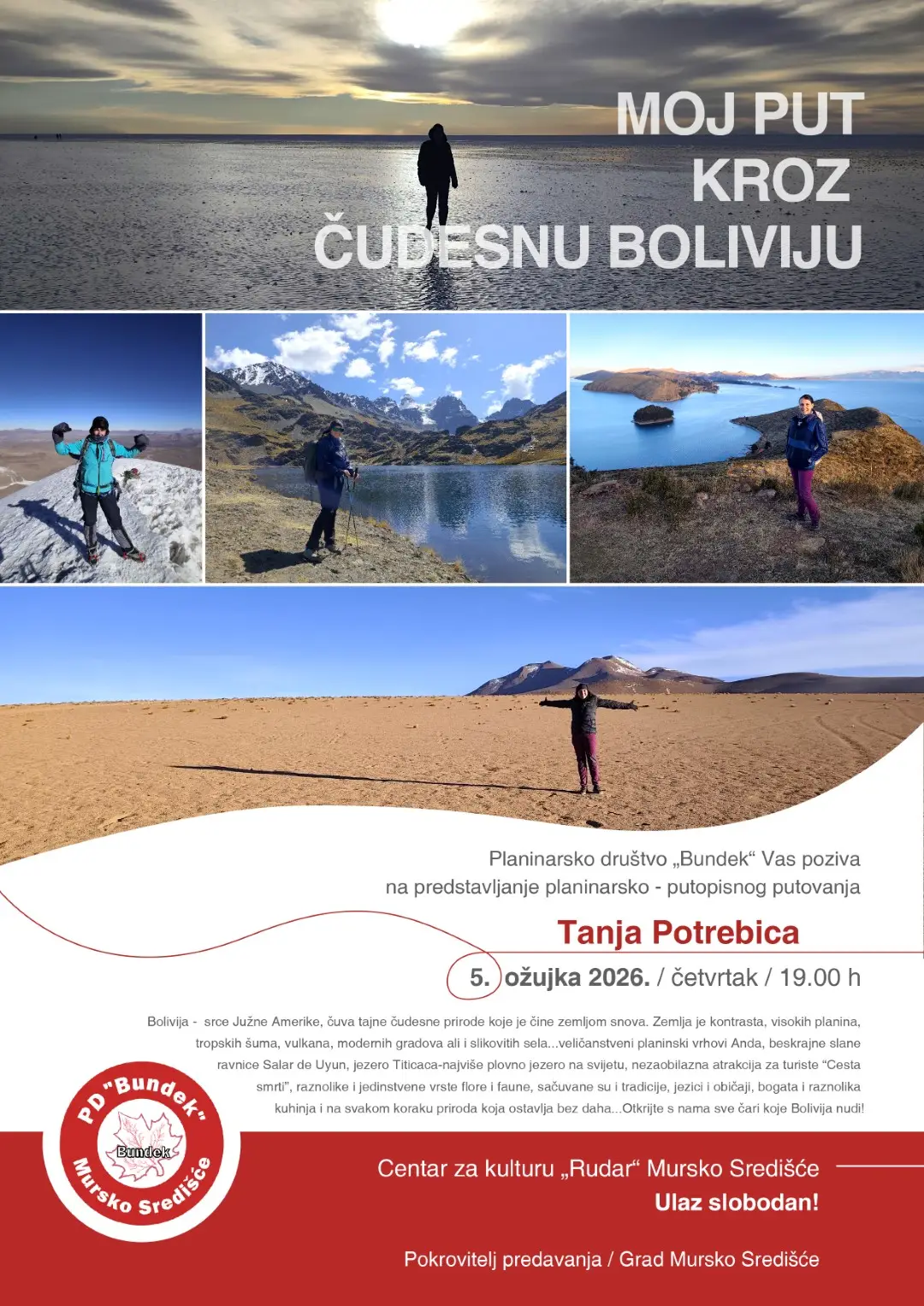 Centar za kulturu „Rudar“ u četvrtak, 5. ožujka 2026. godine s početkom u 19 sati, ugostit će nesvakidašnji putopisni spektakl koji će posjetitelje odvesti u samo srce Južne Amerike. Tanja Potrebica, strastvena planinarka i članica HPD-a „MIV“ Varaždin, predstavit će svoje fascinantno putovanje kroz Boliviju, zemlju nevjerojatnih kontrasta, ekstremnih visina i drevnih civilizacija. Ovo predavanje nije samo niz putopisnih crtica, već duboka i inspirativna priča o treking ekspediciji iz 2025. godine koja je obuhvatila neke od najizazovnijih i najljepših predjela naše planete.