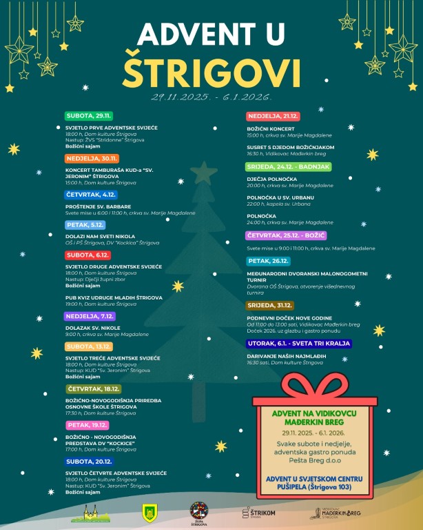 Advent u Štrigovi nastavlja se ove subote programom koji spaja tradiciju, glazbu i druženje za sve generacije, nudeći bogat ugođaj uoči Božića.