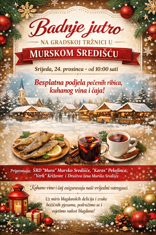 Grad Mursko Središće ovim putem poziva sve ljude dobre volje da dođu u što većem broju, razmijene blagdanske čestitke s prijateljima i susjedima te dopuste da božićni duh ispuni njihova srca prije odlaska svojim domovima na proslavu Badnje večeri. Ovo je izvrsna prilika za kratak predah od blagdanskih priprema i uživanje u toploj atmosferi zajednice.