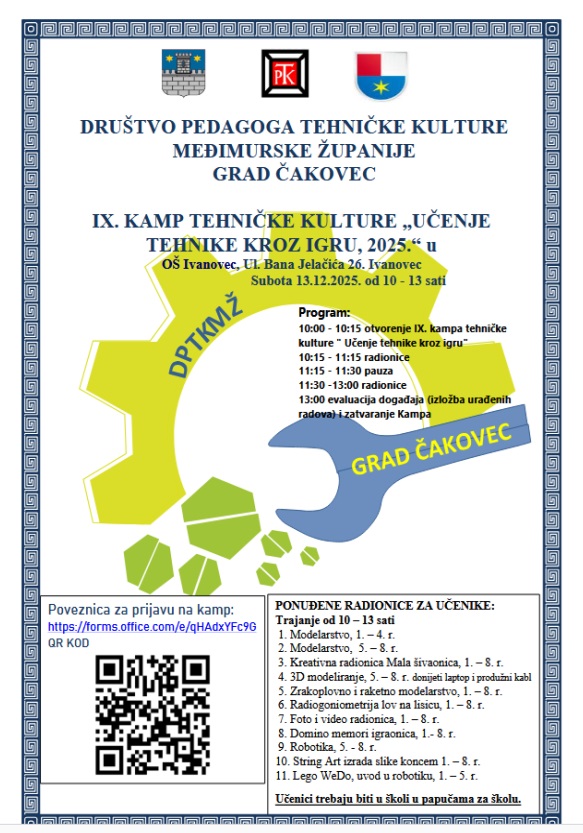 Društvo pedagoga tehničke kulture Međimurske županije, uz podršku Grada Čakovca, Međimurske županije i OŠ Ivanovec, poziva sve učenike osnovnoškolske dobi na sudjelovanje u IX. Kampu tehničke kulture.