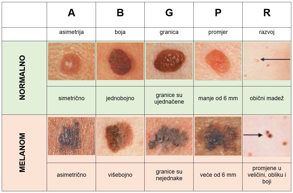 Potreban je oprez kod mrlja i izraslina koje mijenjaju boju i/ili oblik, ako izgledaju drugačije od okolnog tkiva, koje su asimetrične i/ili nepravilnog ruba, grube, ljušte se, koje su raznolikih boja, veće od 6 mm u promjeru, svrbe, krvare ili imaju iscjedak, sjajne površine ili izgledaju poput ranica koje ne zacjeljuju.