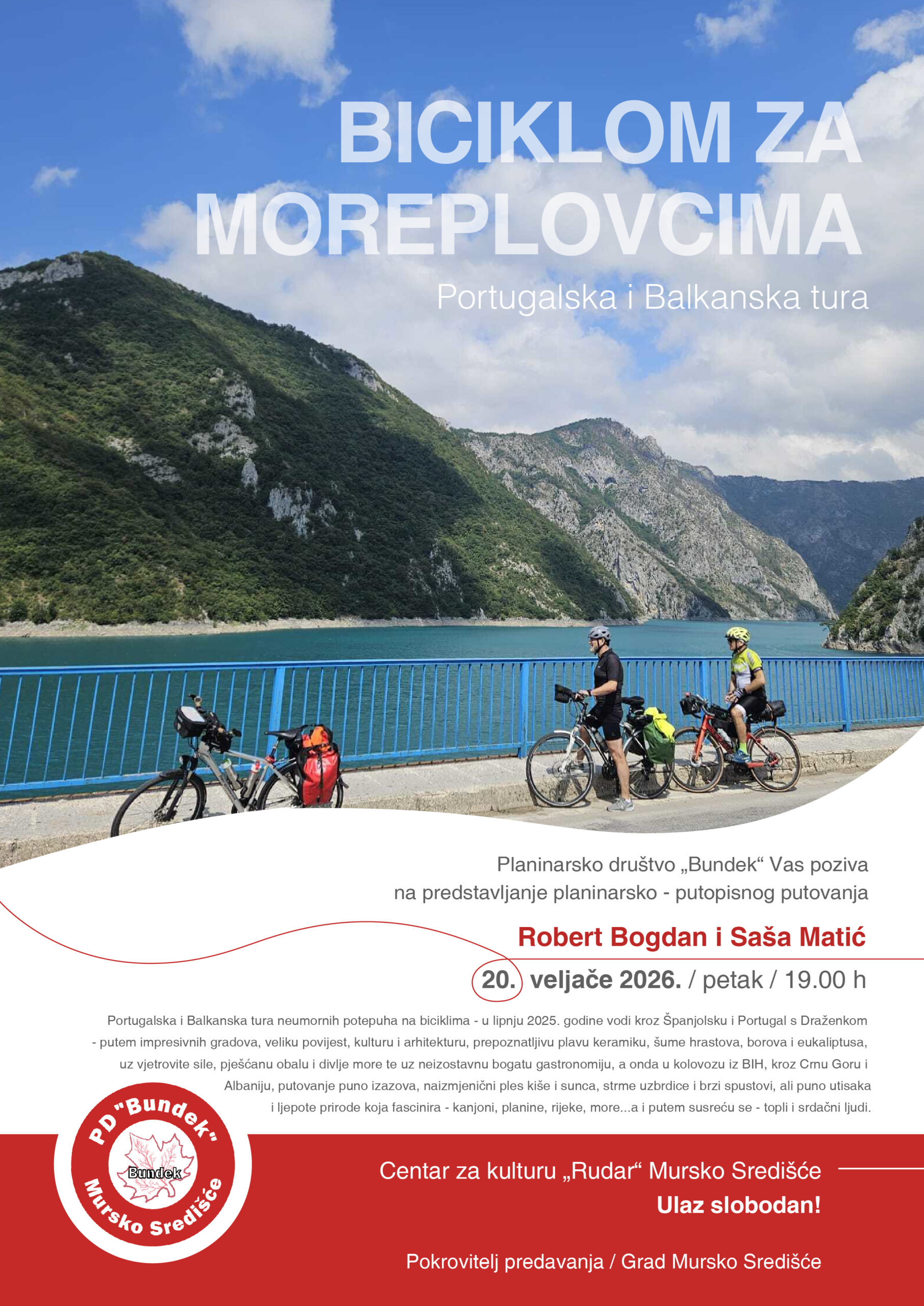 Posjetitelji će u Murskom Središću imati priliku čuti autentične priče o tisućama prijeđenih kilometara, ali i vidjeti fotografije koje dočaravaju surovost kanjona, mirise mora i nezaboravne susrete s ljudima koje su sreli putem. Robert i Saša kroz svoje izlaganje vješto isprepliću sportske izazove, poput savladavanja strmih uspona, s dubokim poštovanjem prema povijesti i tradiciji zemalja kroz koje prolaze. Njihova su predavanja poznata po tome što publiku ne ostavljaju samo u ulozi promatrača, već u njoj bude onaj poznati nemir u srcu koji nas sve ponekad tjera da krenemo u nepoznato.