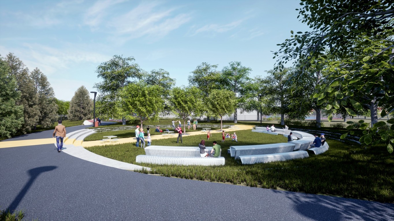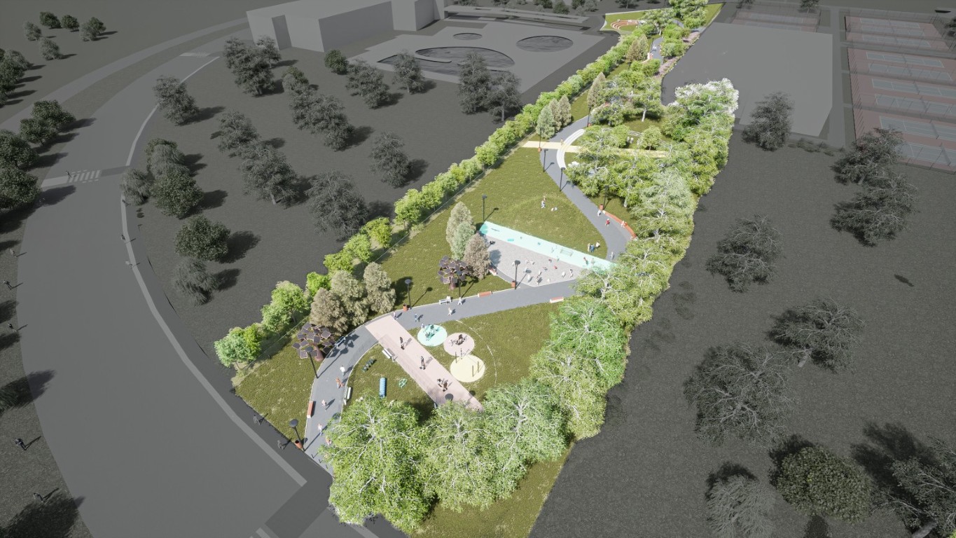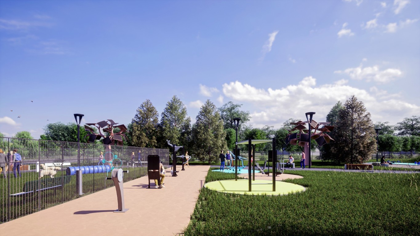 Središnja os novog parka bit će dinamična šetnica projektirana u obliku blago zakrivljene zavojnice. Duž njezine trase razvijat će se tematske zone koje uključuju dječja igrališta, prostore za vježbanje na otvorenom te posebnu zonu za rekreaciju pasa. Jedan od zanimljivijih elemenata dizajna je oblikovani humak koji će ljeti služiti za igru, a zimi kao sanjkalište za najmlađe. Cijeli prostor bit će opremljen modernim urbanim mobilijarom i rasvjetom, potičući kružno kretanje i povezivanje s postojećim atletskim stazama i stadionom.