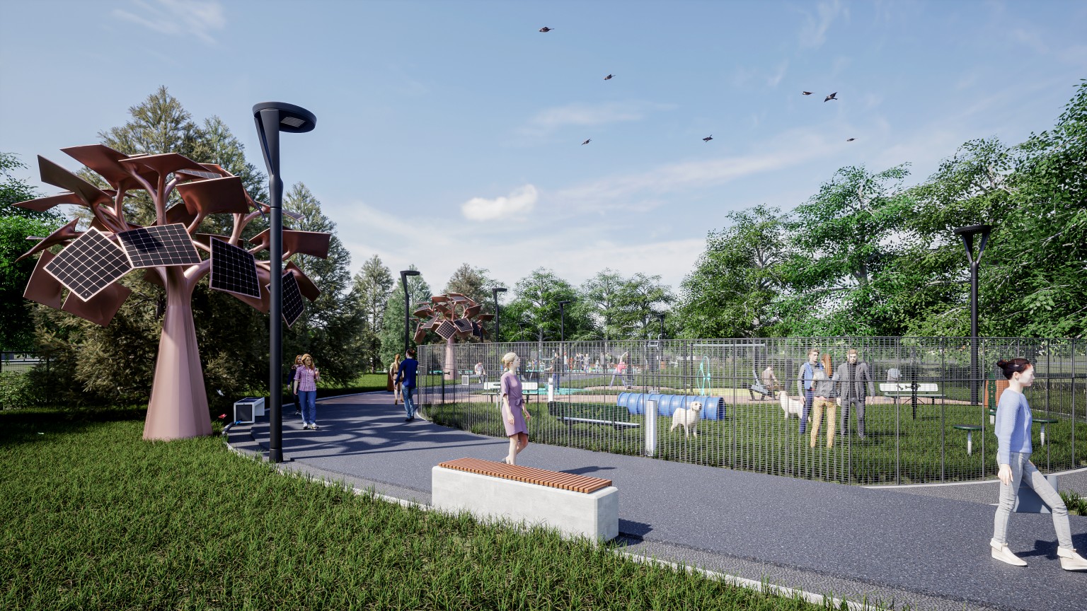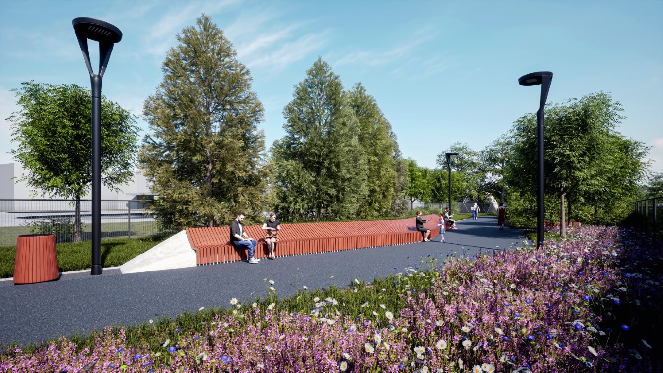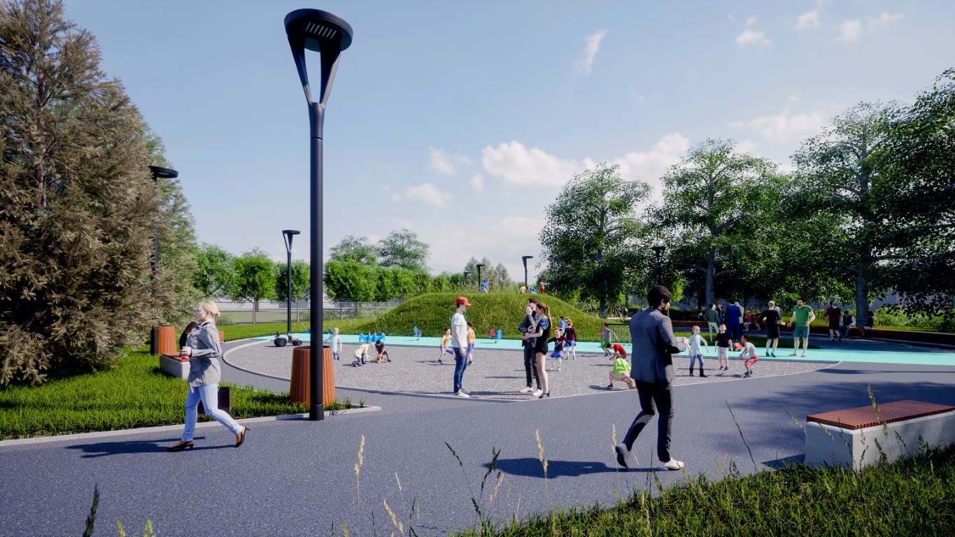 Središnja os novog parka bit će dinamična šetnica projektirana u obliku blago zakrivljene zavojnice. Duž njezine trase razvijat će se tematske zone koje uključuju dječja igrališta, prostore za vježbanje na otvorenom te posebnu zonu za rekreaciju pasa. Jedan od zanimljivijih elemenata dizajna je oblikovani humak koji će ljeti služiti za igru, a zimi kao sanjkalište za najmlađe. Cijeli prostor bit će opremljen modernim urbanim mobilijarom i rasvjetom, potičući kružno kretanje i povezivanje s postojećim atletskim stazama i stadionom.