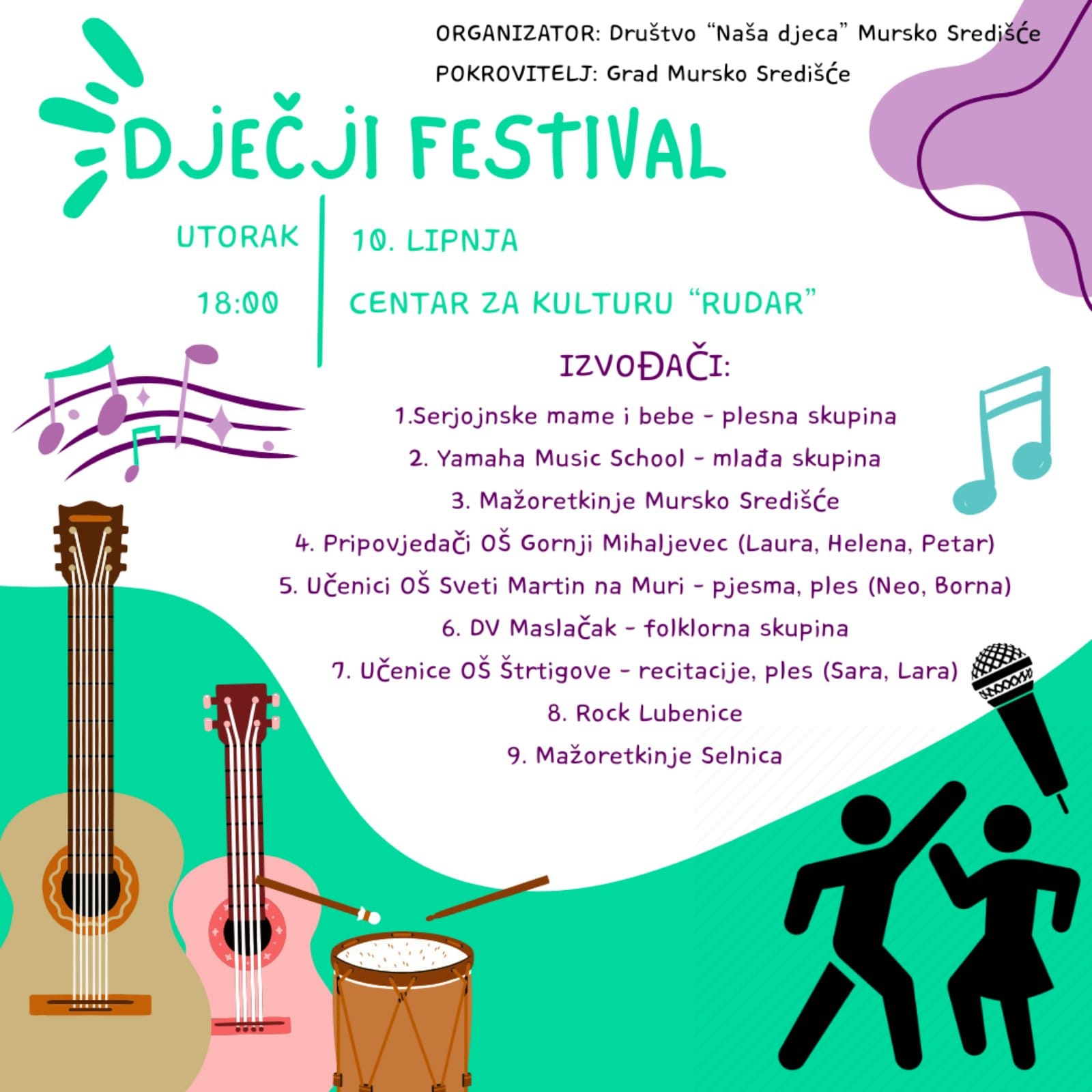 Društvo „Naša djeca“ Mursko Središće godinama je aktivno u organizaciji sadržaja za najmlađe, a ovog utorka, 10. lipnja, u 18:00 sati, u Centru za kulturu „Rudar“ očekuje vas poseban događaj – Dječji festival!