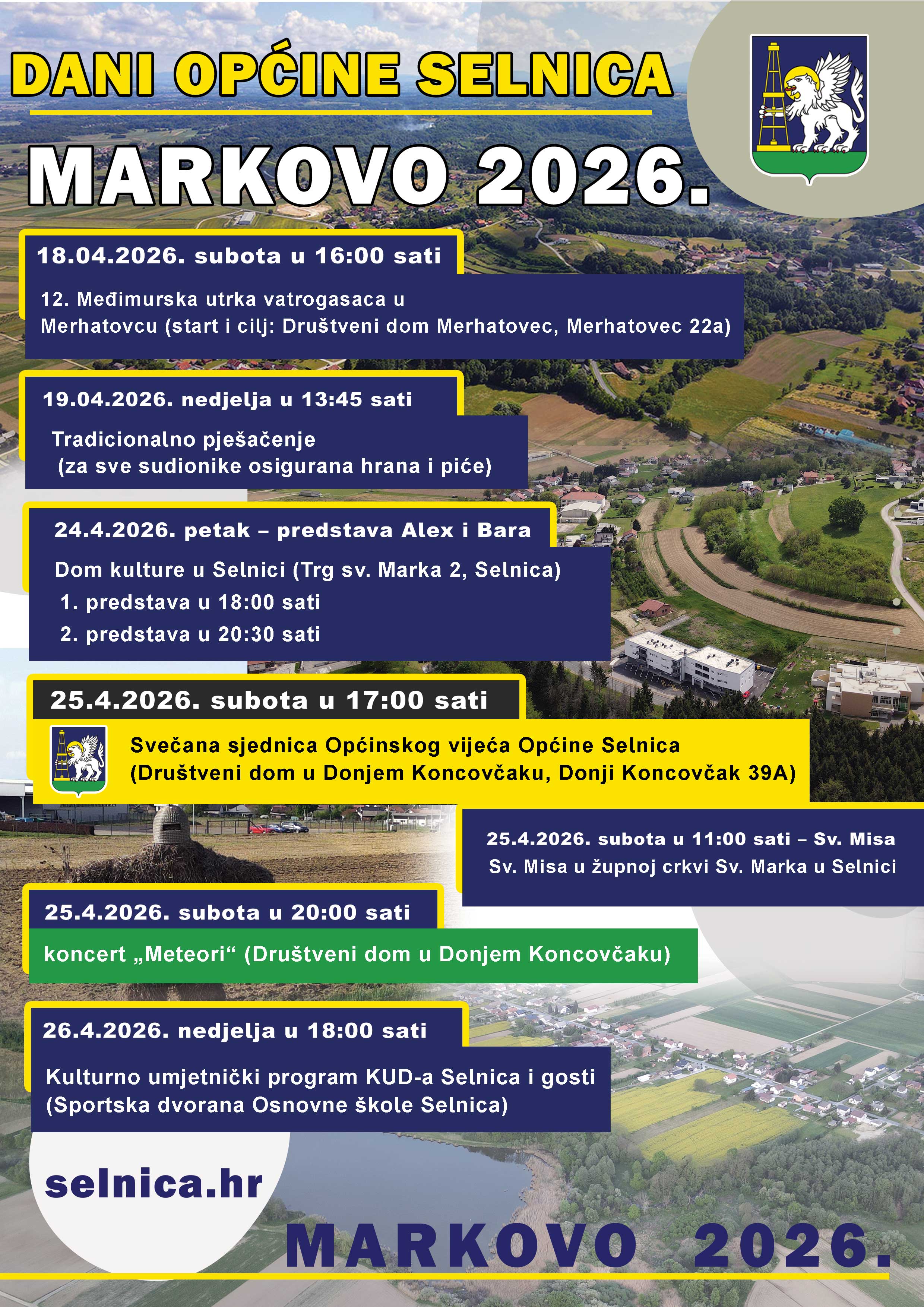 Manifestacija „Markovo 2026.“ završava u nedjelju, 26. travnja, velikim kulturno-umjetničkim programom. U sportskoj dvorani Osnovne škole Selnica s početkom u 18:00 sati nastupit će domaćini iz KUD-a Selnica sa svojim gostima, čime će se na najljepši način – pjesmom i plesom – zaokružiti ovogodišnji Dani općine.
