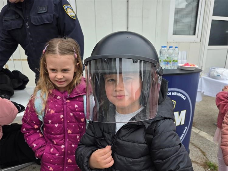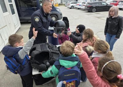 Vidjeli su i policijskog službenika interventne policije sa specijalnom opremom koji im je demonstrirao kako se koristi zaštitni prsluk i kaciga te druga oprema tog zasebnog dijela policije.