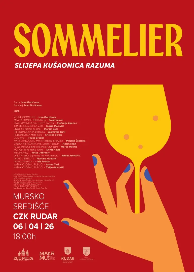 Centar za kulturu „Rudar“ u Murskom Središću ugostit će na Uskrsni ponedjeljak, 6. travnja 2026. godine, s početkom u 18:00 sati, hvaljenu predstavu Dramske družine KUD-a Mura. Naslovljena „SOMMELIER – Slijepa kušaonica razuma“, ova kazališna igra predstavlja odmak od klasičnih dramskih formi i uvlači publiku u intrigantan eksperiment. Iako se na prvi pogled može činiti da je riječ o priči o vinu, predstava zapravo secira ljudsku psihu, koristeći vino samo kao kulisu za dublje propitivanje društvenih uloga i individualne taštine.