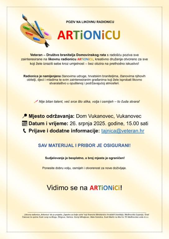 VETERAN s radošću poziva sve zainteresirane na likovnu radionicu “ARTiONiCU”. Ovo kreativno druženje otvoreno je za sve koji žele izraziti sebe kroz umjetnost, bez obzira na prethodno iskustvo. Radionica je namijenjena članovima udruge, hrvatskim braniteljima, članovima njihovih obitelji, djeci i mladima te svim zainteresiranim građanima koji žele isprobati likovno stvaralaštvo u opuštenoj i podržavajućoj atmosferi. Kako poručuju organizatori: “Nije bitan talent, već srce što slika, volja i osmijeh – to čuda stvara!”