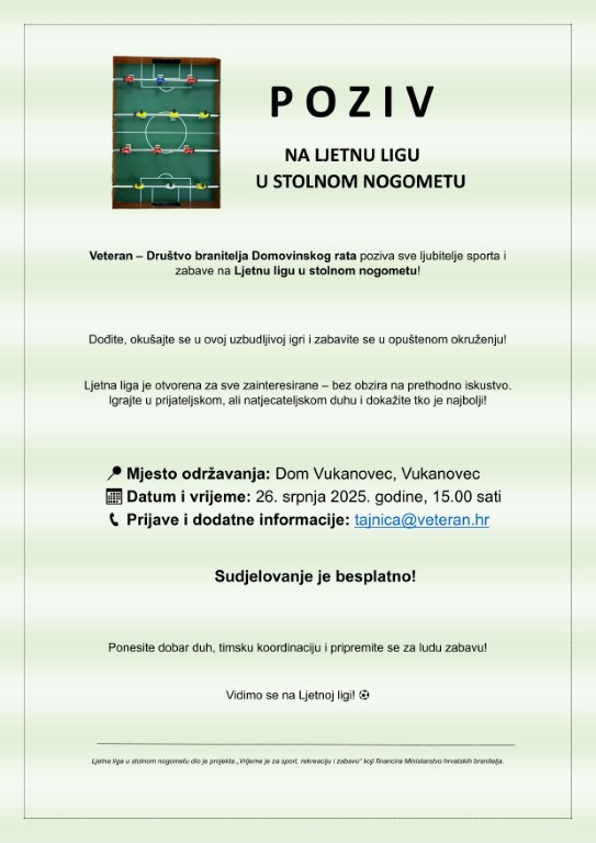 Uz likovnu radionicu, Društvo VETERAN poziva sve ljubitelje sporta i zabave na Ljetnu ligu u stolnom nogometu. Dođite i okušajte se u ovoj uzbudljivoj igri te se zabavite u opuštenom okruženju. Ljetna liga je otvorena za sve zainteresirane, bez obzira na prethodno iskustvo. “Igrajte u prijateljskom, ali natjecateljskom duhu i dokažite tko je najbolji!” poručuju organizatori.