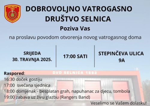 Ovo je izvrsna prilika da zajedno proslavimo ovaj važan trenutak za DVD Selnica i da izrazimo iskrenu zahvalnost svim pojedincima, udrugama i institucijama koji su svojim doprinosom omogućili realizaciju ovog projekta. Novi vatrogasni dom značajno će unaprijediti operativne sposobnosti Društva i osigurati još bržu i učinkovitiju zaštitu naše zajednice.