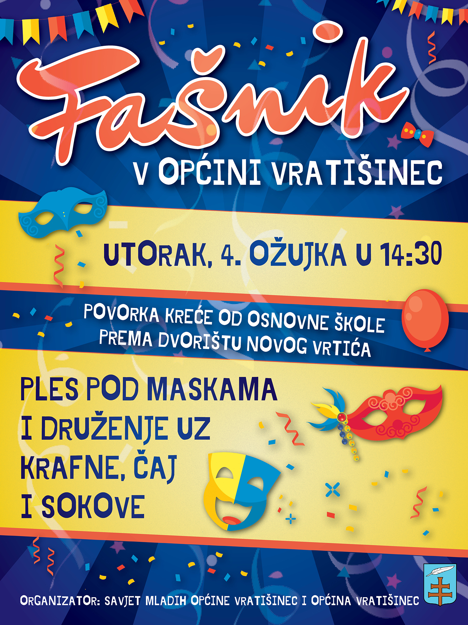 Savjet mladih Općine Vratišinec s radošću poziva sve mještane, od najmlađih do najstarijih, na tradicionalno fašničko veselje koje će se održati u utorak, 4. ožujka, s početkom u 14:30 sati.