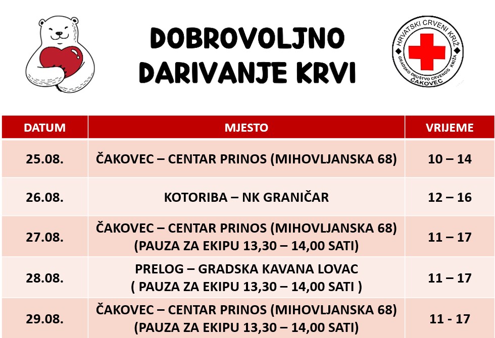 Raspored akcija dobrovoljnog darivanja krvi u organizaciji GDCK Čakovec: