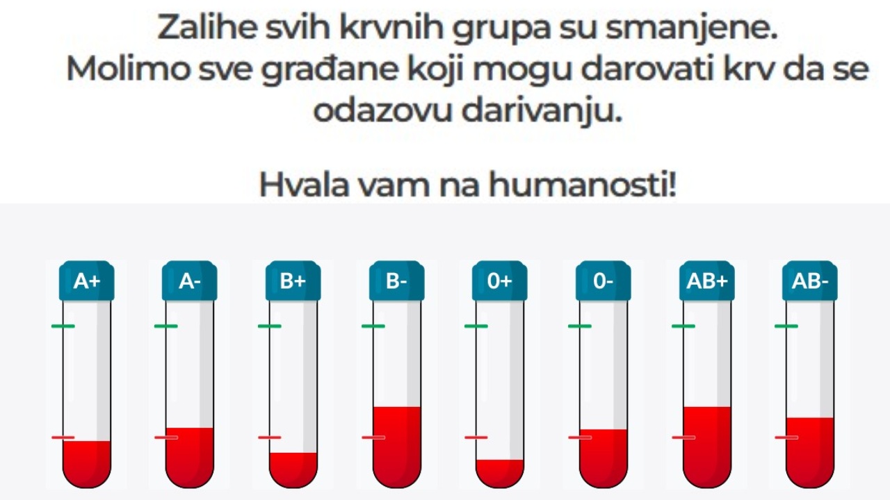 Hrvatski zavod za transfuzijsku medicinu (HZTM) uputio je apel svim građanima da se odazovu darivanju krvi, budući da su zalihe svih krvnih grupa smanjene, a naročito one nula pozitivne.