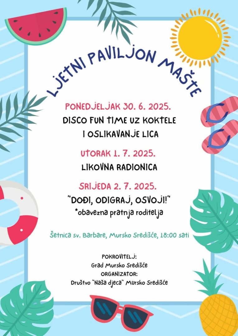 Ljetni paviljon mašte donosi pregršt zabavnih sadržaja: od kreativnih radionica, disco programa pa sve do sportskih poligona. Poseban naglasak stavljen je na poticanje mašte, razvoj timskog duha te uživanje u predivnom prirodnom ambijentu šetnice uz rijeku Muru.
