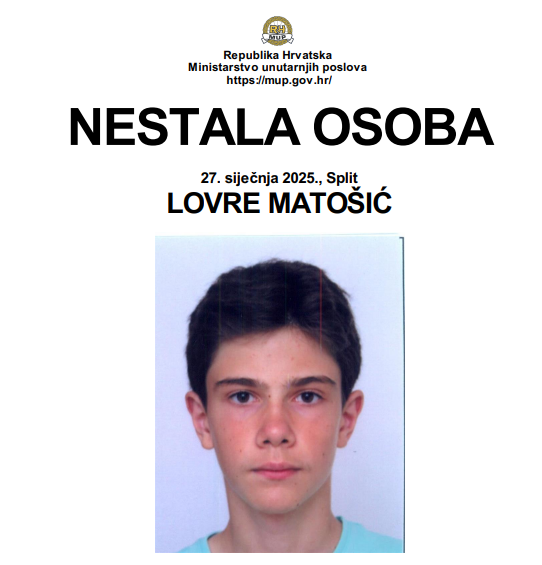 U trenutku nestanka bio je odjeven u maslinastu trenirku s kapuljačom, sive hlače, te obučen u crne tenisice s bijelim đonom i na leđima je nosio crni ruksak.
