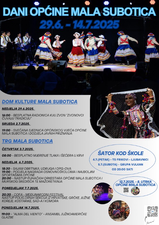 Vikend koji slijedi donosi prave glazbene poslastice. U petak, 4. srpnja, šator ispred Osnovne škole Mala Subotica ugostit će popularni Tamburaški sastav “Frikovi” i “Ljubavnike”, garanciju odlične zabave i plesa do kasno u noć. Nastavak glazbenog ugođaja očekuje nas u subotu, 5. srpnja, kada će istu pozornicu preuzeti Grupa Vulkan, obećavajući još jednu nezaboravnu večer.