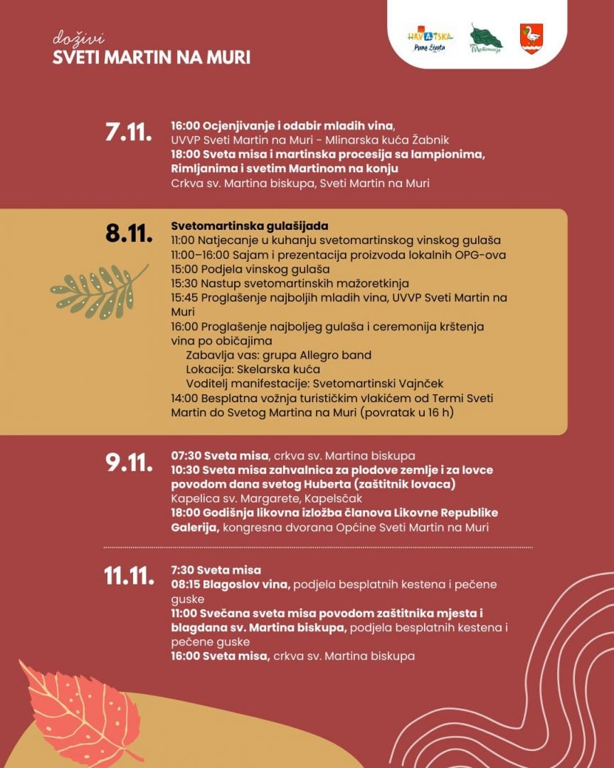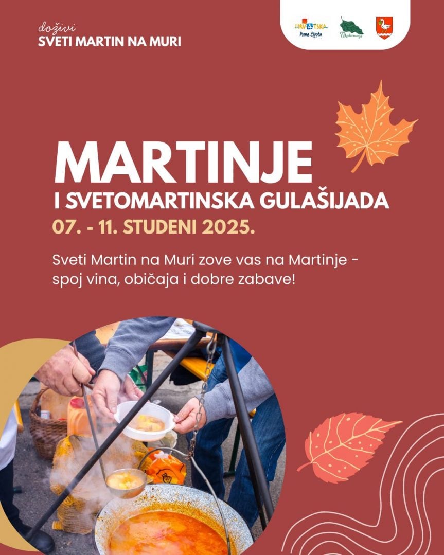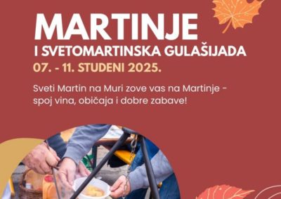 Turistička zajednica Sveti Martin na Muri, destinacije aktivnog odmora i kvalitetnog življenja, poziva sve da zabilježe datum i pridruže se fešti. Martinje i Gulašijada – tradicija i zabava na jednom mjestu!