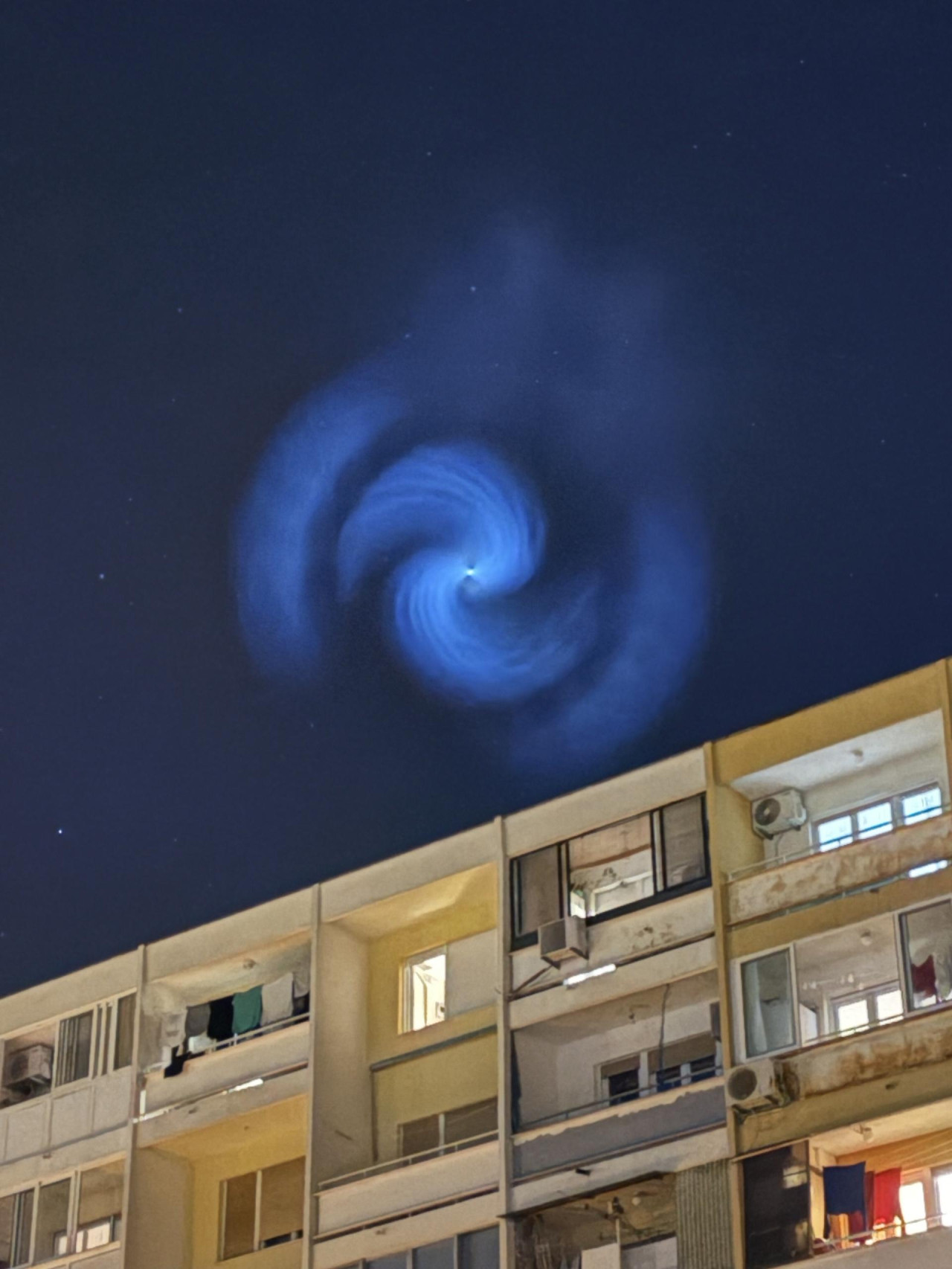 Pojava je spiralnog oblika jer se Falcon 9 prilikom izbacivanja goriva zavrtio oko svoje osi.