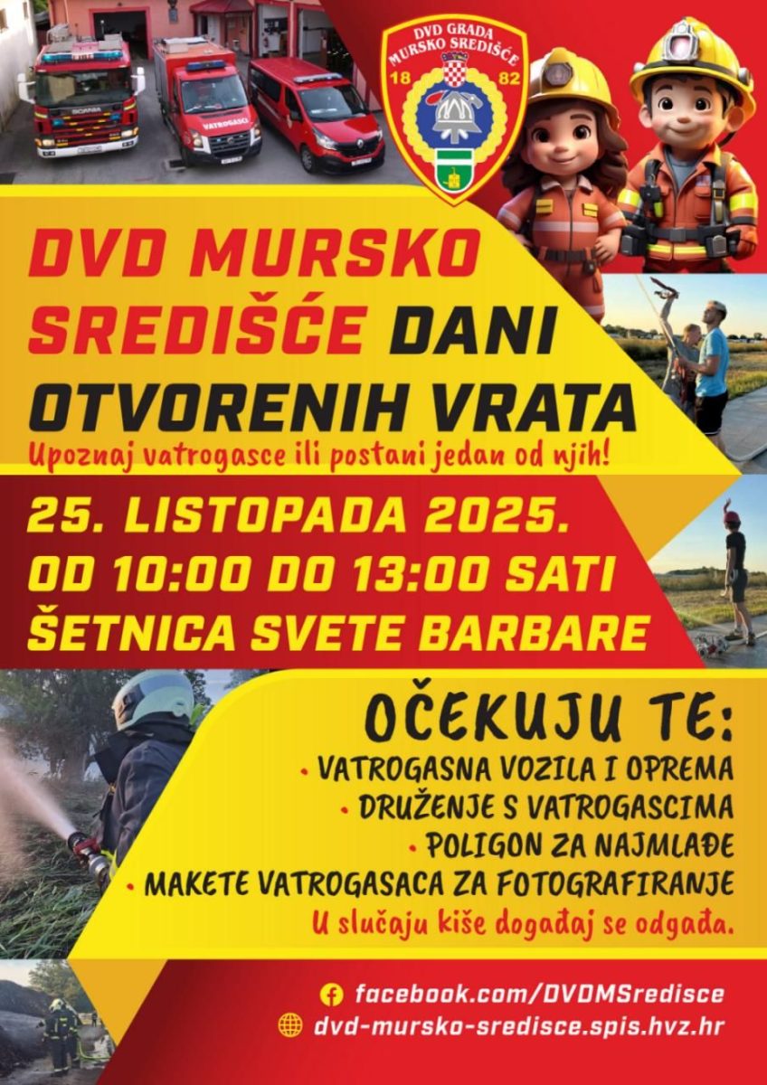 Dobrovoljno vatrogasno društvo (DVD) Mursko Središće otvara svoja vrata i poziva sve građane, a posebice najmlađe, da im se pridruže na šetnici Svete Barbare u subotu, 25. listopada 2025., od 10 do 13 sati. Ovaj događaj, organiziran pod nazivom Dani otvorenih vrata...