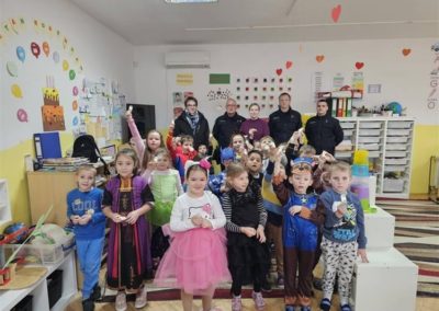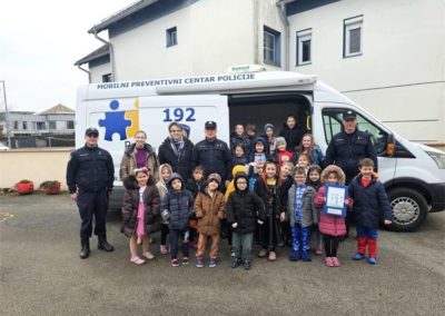 Nakon rada s odraslima, policajci su posjetili Dječji vrtić “Jelenko”, gdje su se družili s mališanima iz skupine “Sovići”. Cilj posjeta bio je približiti policijsku službu djeci kako bi je od najranije dobi doživljavali kao instituciju kojoj se uvijek mogu obratiti za pomoć. Djeca su kroz igru učila o prepoznavanju i zaustavljanju nasilja, a policajci su im podijelili reflektirajuće privjeske-svjetiljke, osigurane sredstvima Vijeća za prevenciju Međimurske županije.