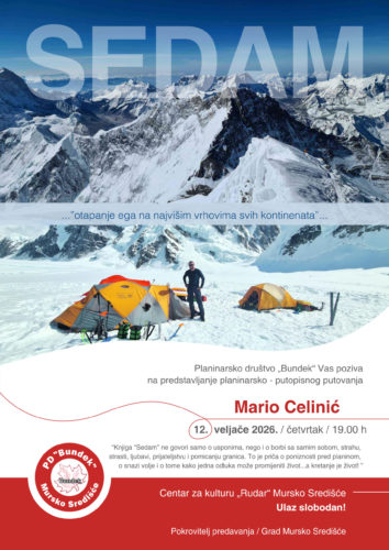Planinarsko društvo Bundek poziva sve ljubitelje planina, putovanja i motivacijskih životnih priča na predavanje i predstavljanje knjige „Sedam“ autora Marija Celinića. Događaj će se održati u četvrtak, 12. veljače 2026. godine, s početkom u 19 sati.