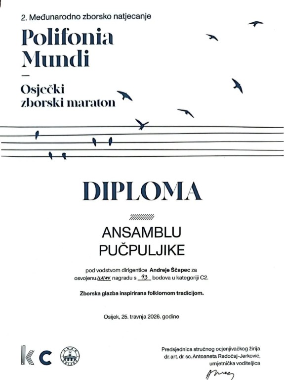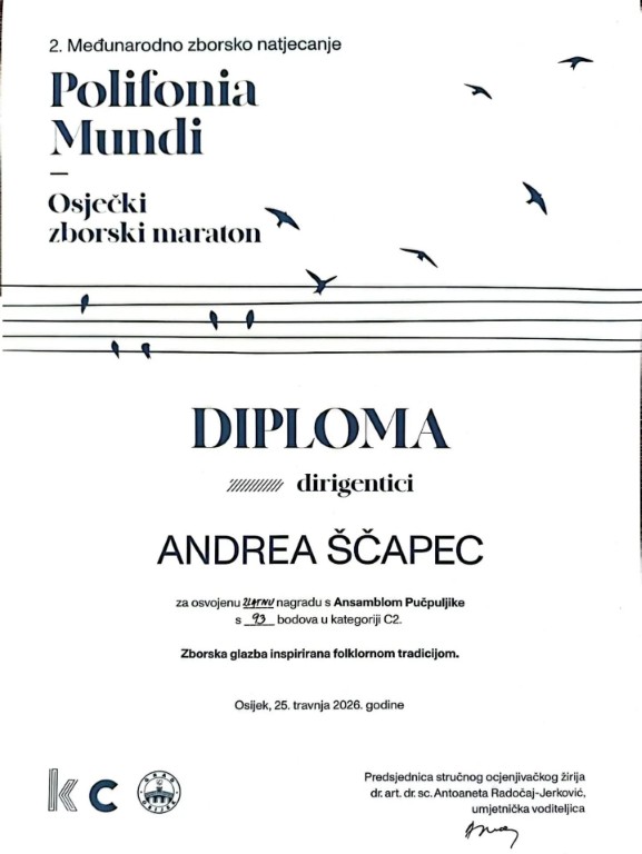 Međimurski melos još je jednom zasjao u punom sjaju, ovaj put u srcu Slavonije. U prestižnoj dvorani Franjo Krežma Kulturnog centra Osijek, održano je drugo izdanje natjecanja Polifonia Mundi, koje je okupilo vrhunske vokalne sastave, a kući se s najsjajnijim odličjem vraćaju međimurske pjevačice pod vodstvom maestralne Andree Ščapec.