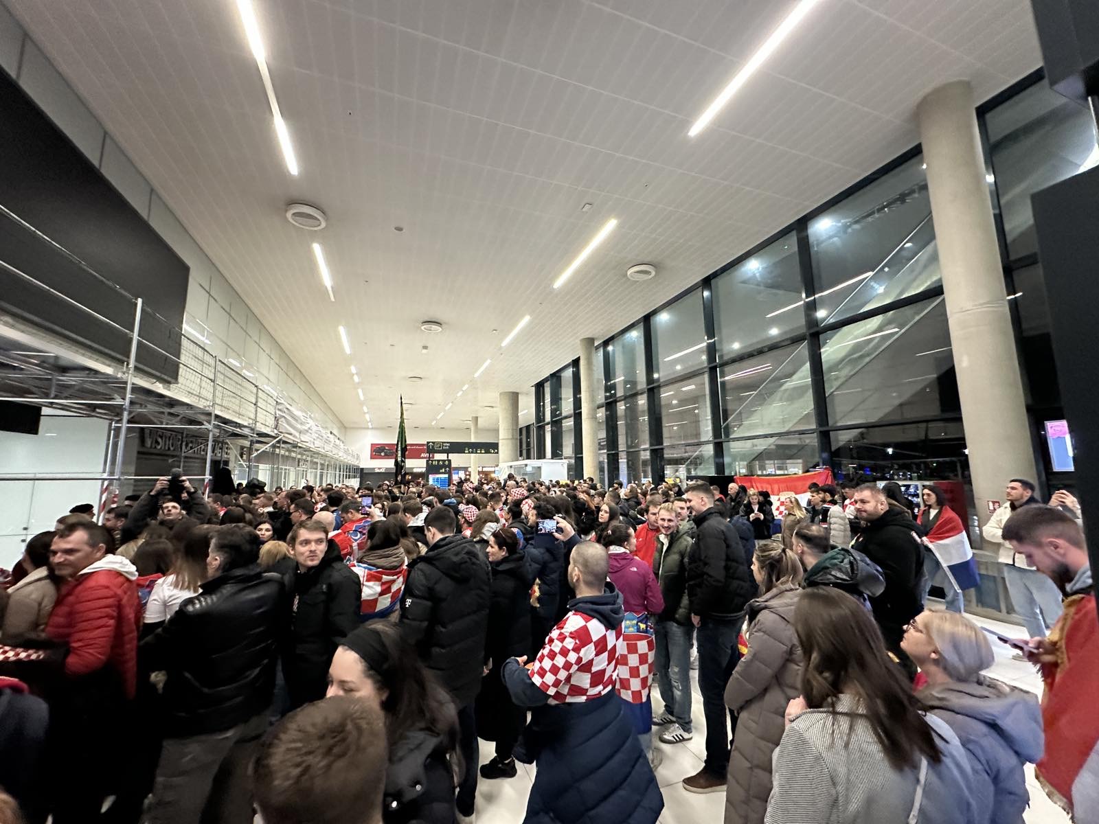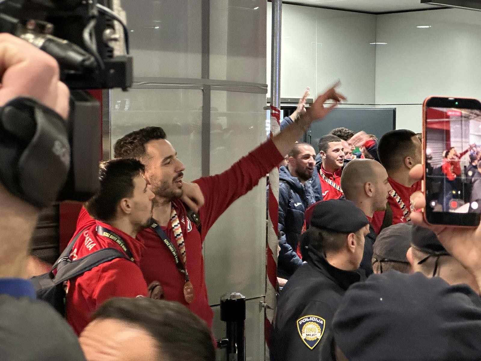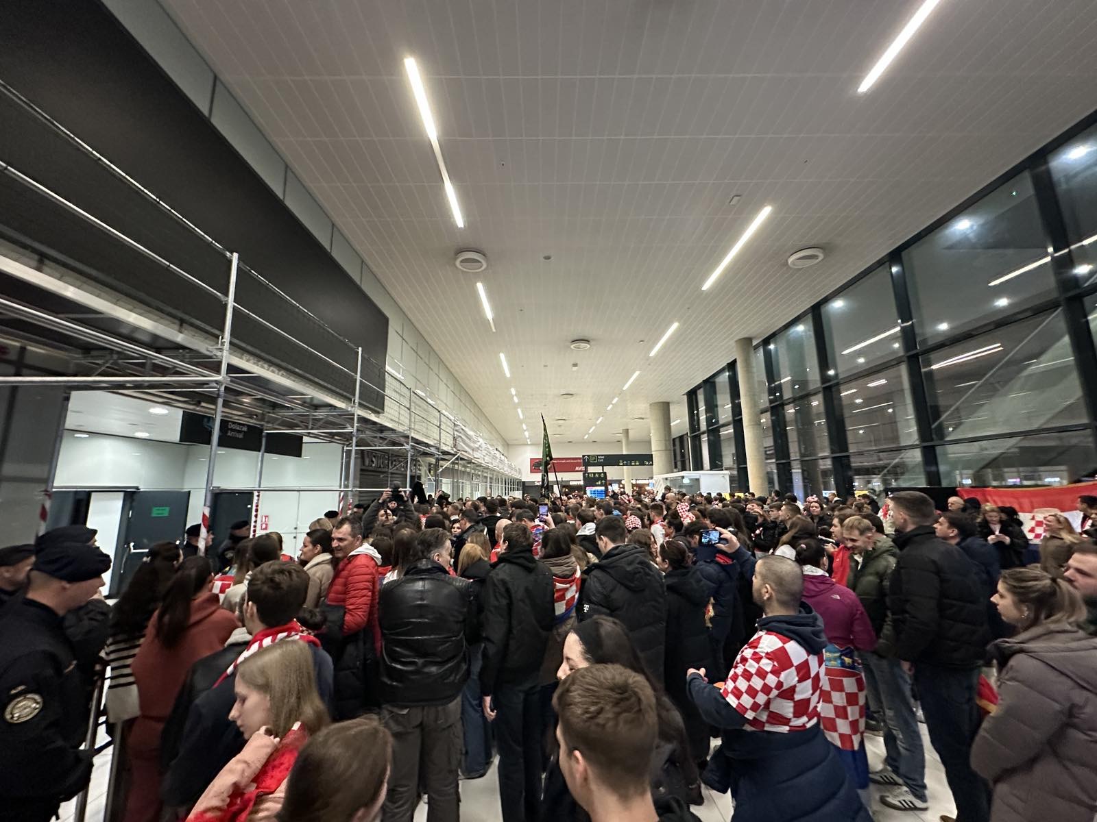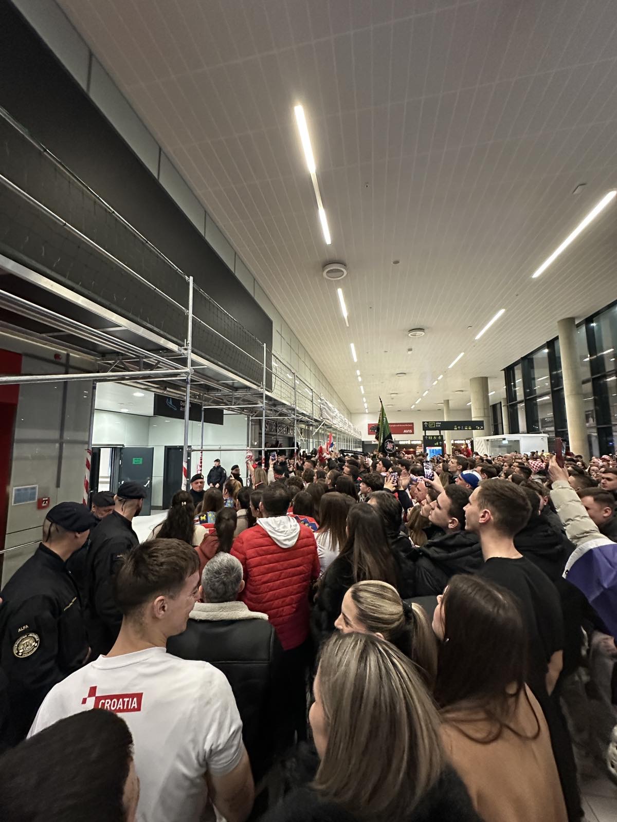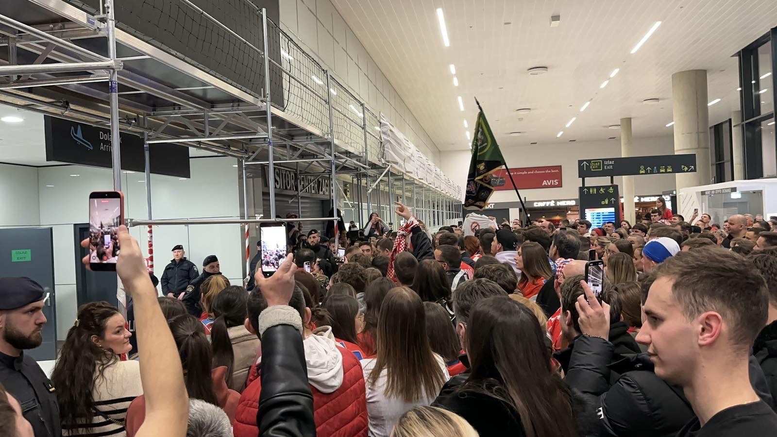 Reprezentacija je iz Danske sletjela iza 3:00 sata ujutro, a stotine navijača opremljenih zastavama i dresovima priredilo je doček za pamćenje. Prostorom su odjekivali hitovi Marka Perkovića Thompsona, Prljavog kazališta i Jure Stublića, dok su igrači dočekani ovacijama uz pjesmu „Ako ne znaš šta je bilo“.