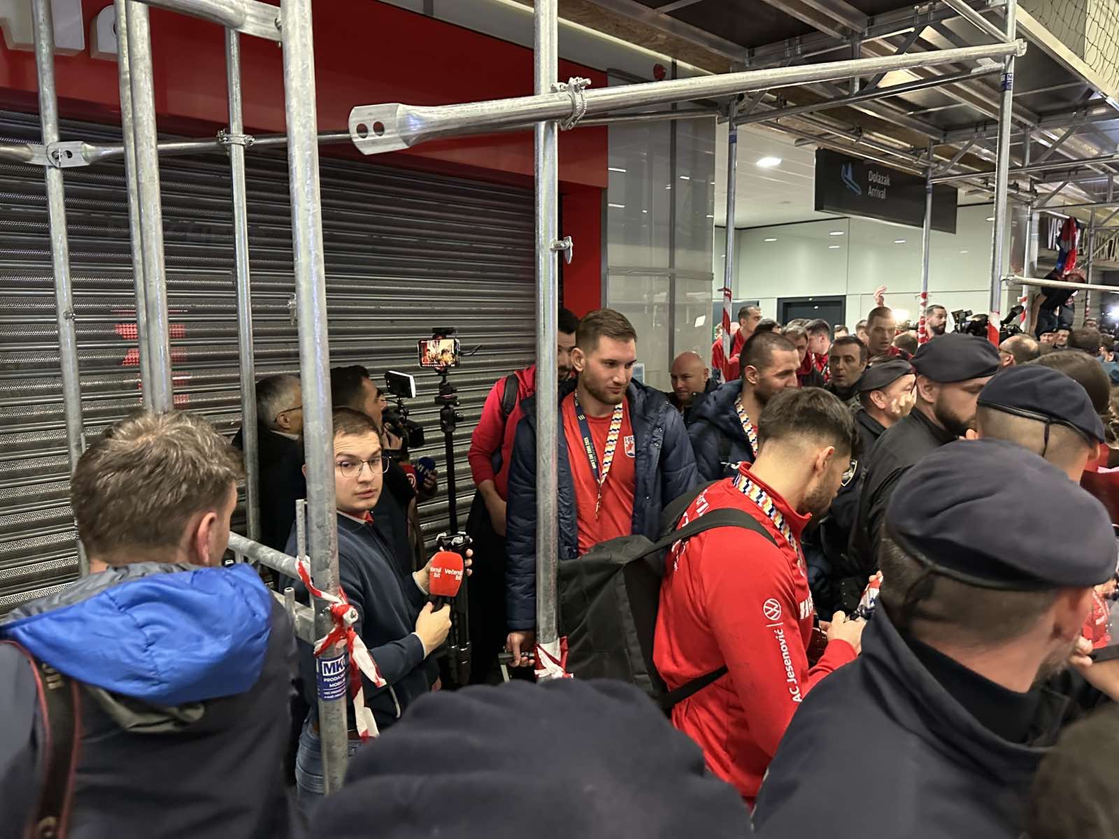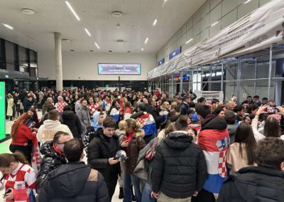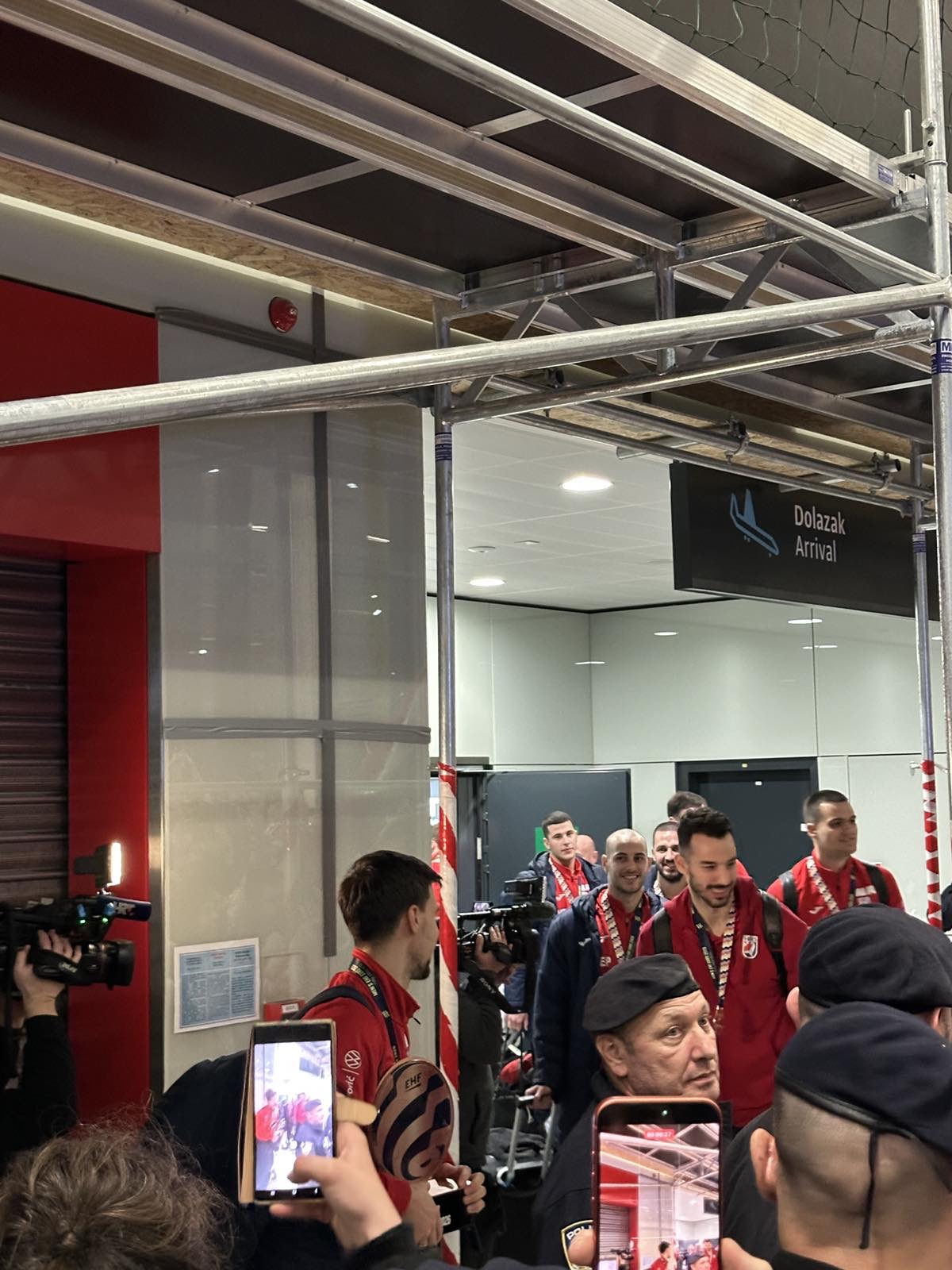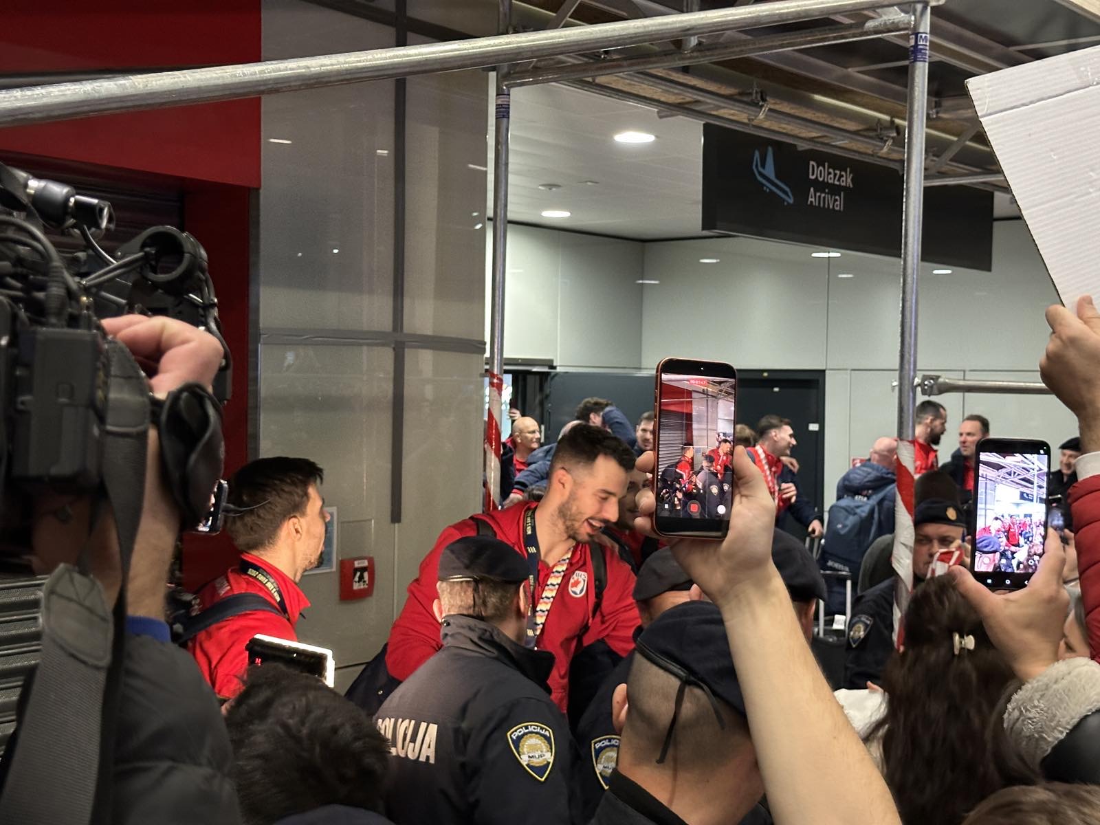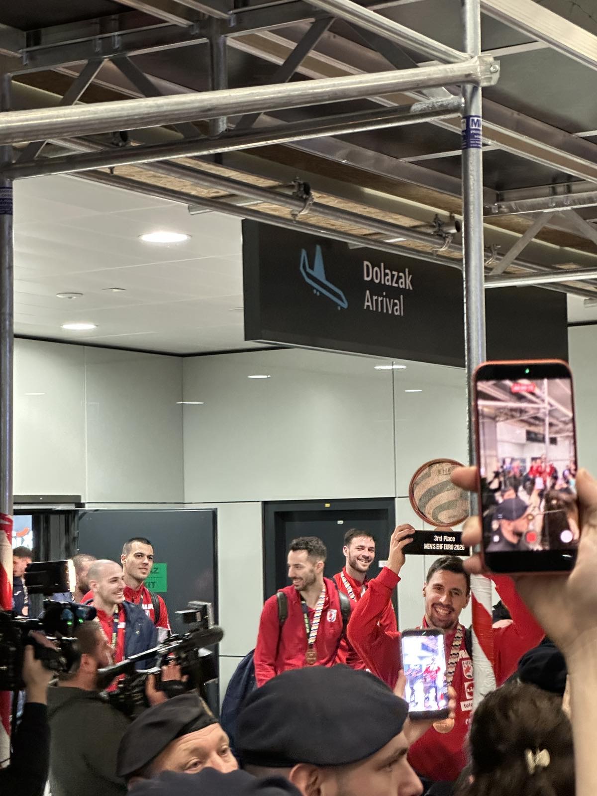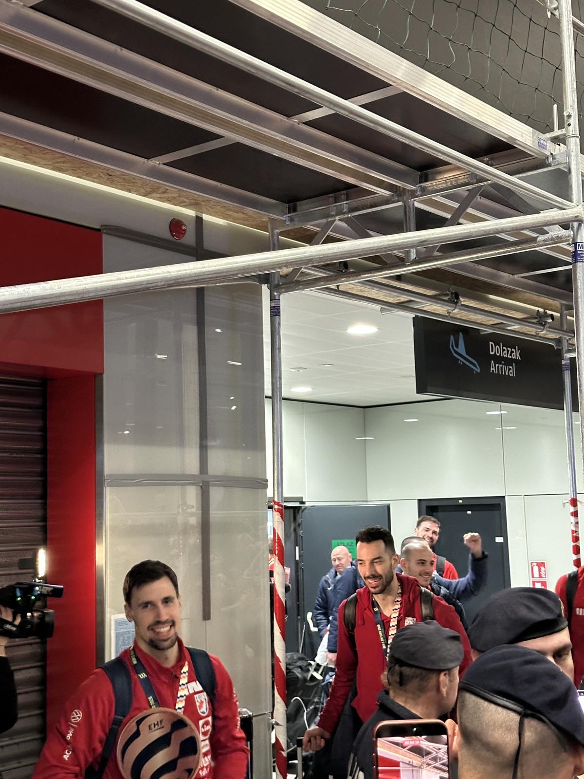 Reprezentacija je iz Danske sletjela iza 3:00 sata ujutro, a stotine navijača opremljenih zastavama i dresovima priredilo je doček za pamćenje. Prostorom su odjekivali hitovi Marka Perkovića Thompsona, Prljavog kazališta i Jure Stublića, dok su igrači dočekani ovacijama uz pjesmu „Ako ne znaš šta je bilo“.