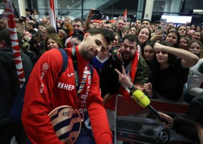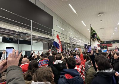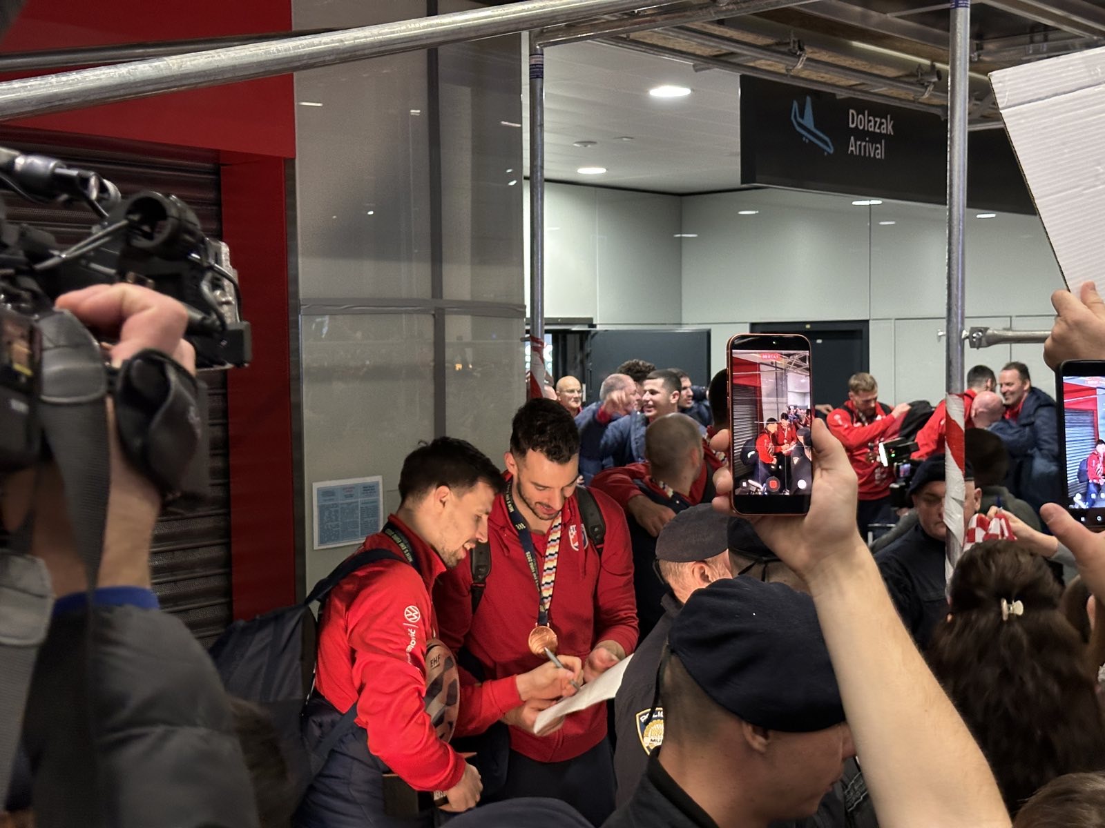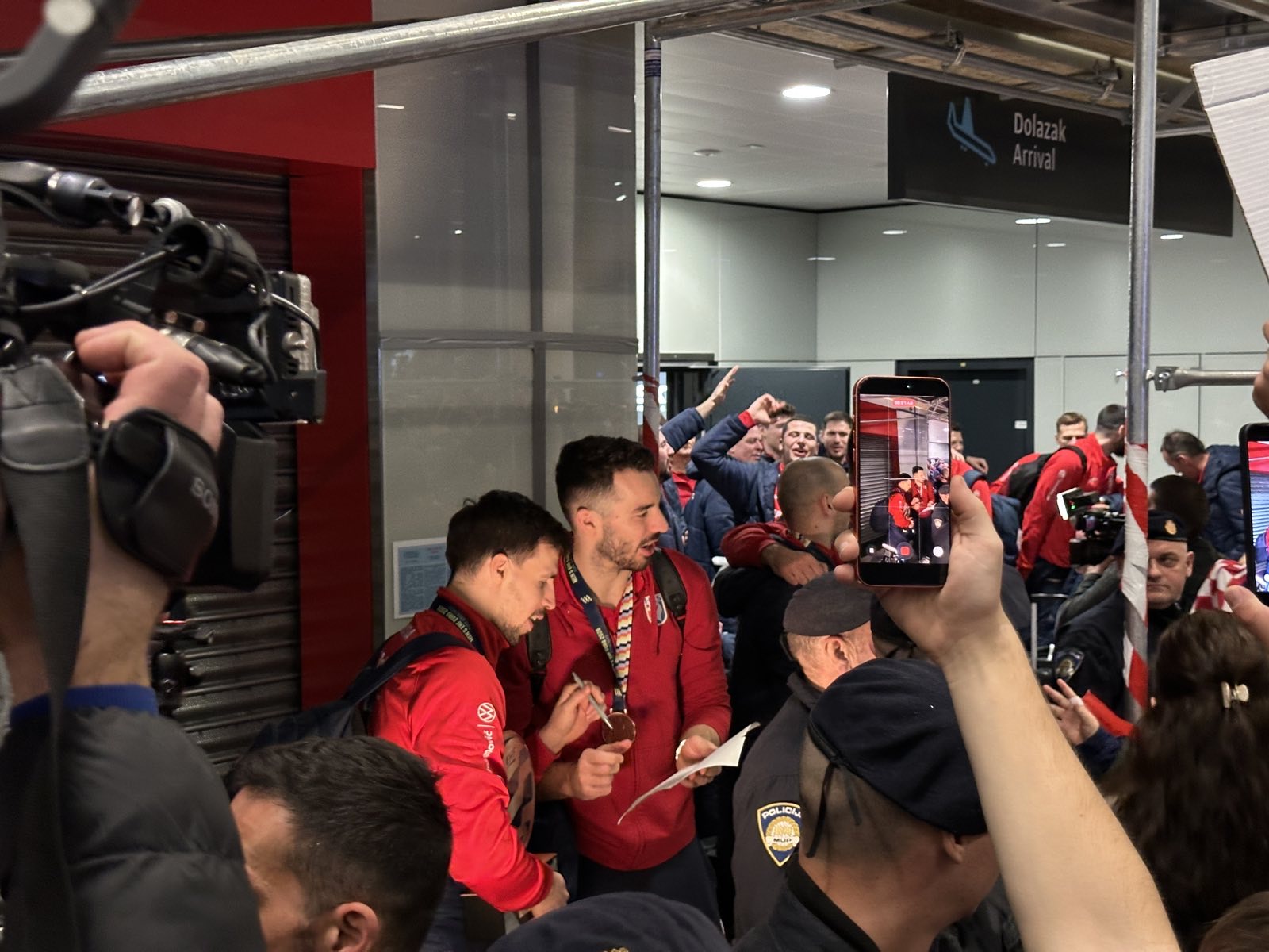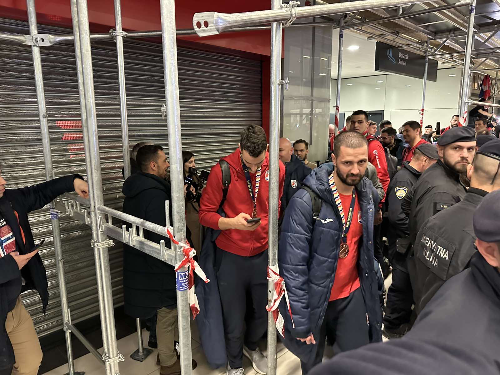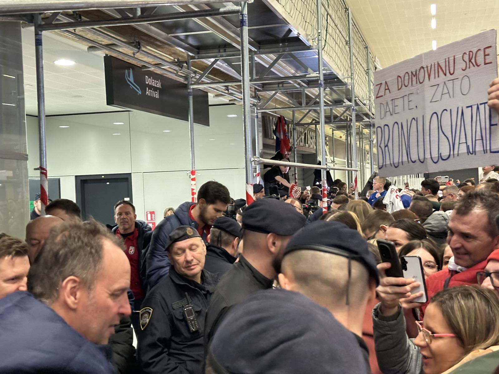 Reprezentacija je iz Danske sletjela iza 3:00 sata ujutro, a stotine navijača opremljenih zastavama i dresovima priredilo je doček za pamćenje. Prostorom su odjekivali hitovi Marka Perkovića Thompsona, Prljavog kazališta i Jure Stublića, dok su igrači dočekani ovacijama uz pjesmu „Ako ne znaš šta je bilo“.