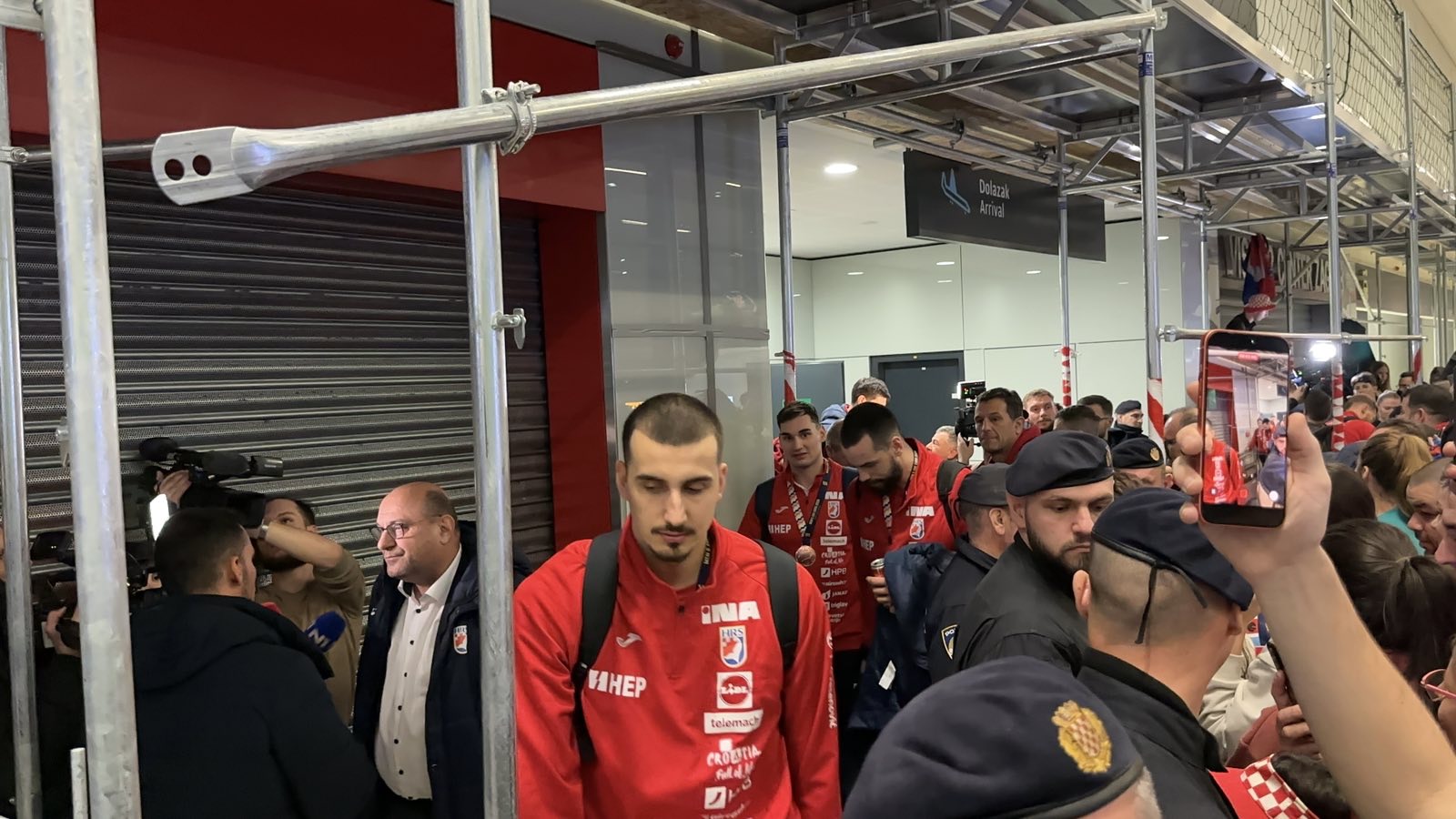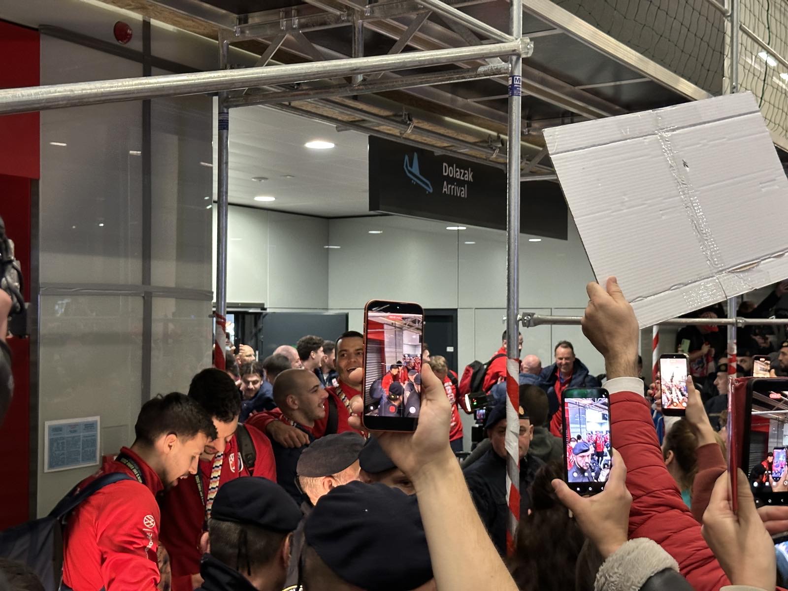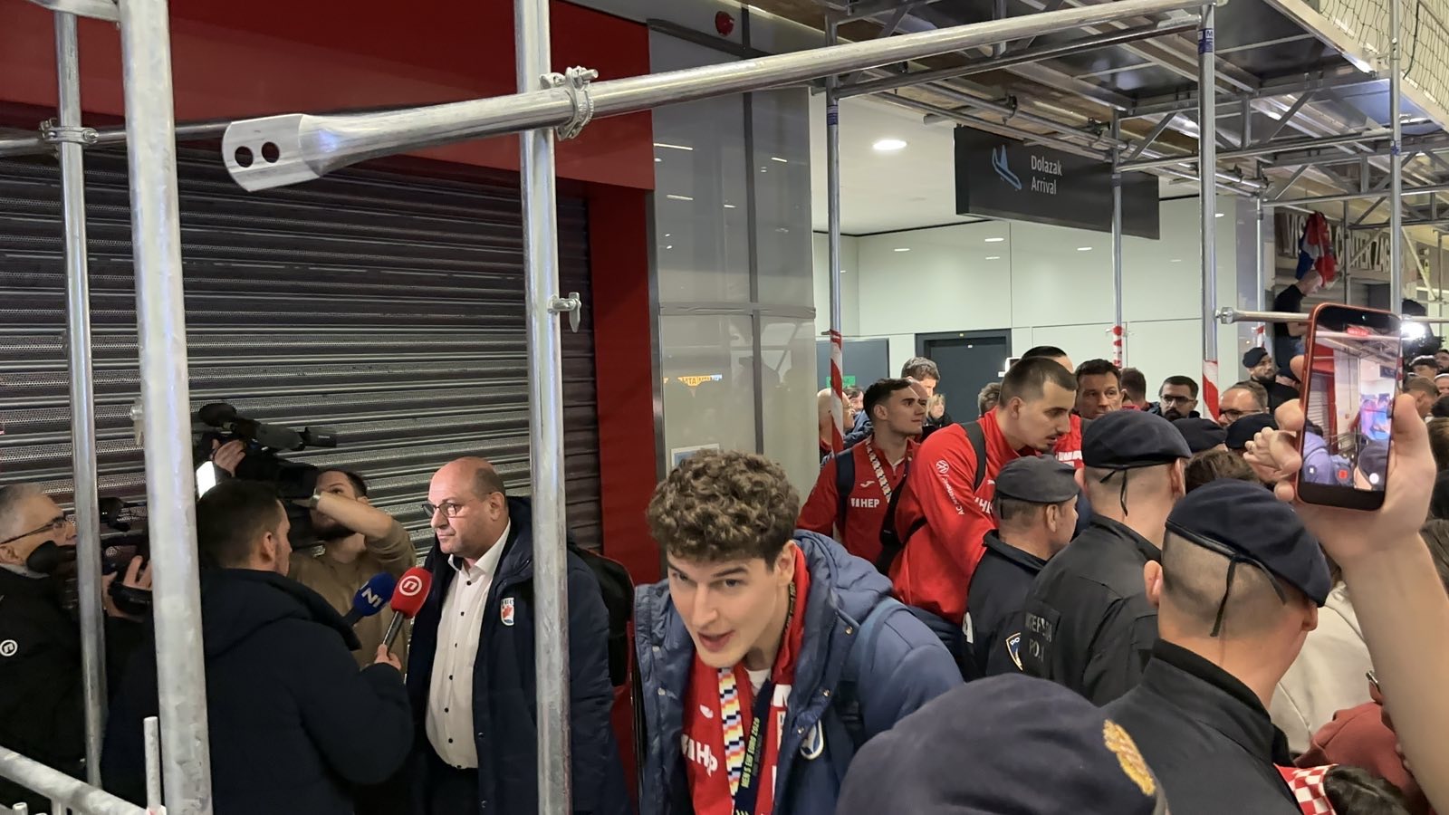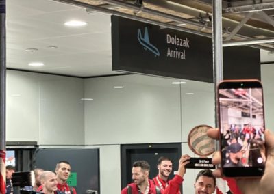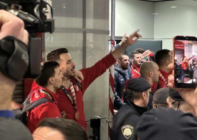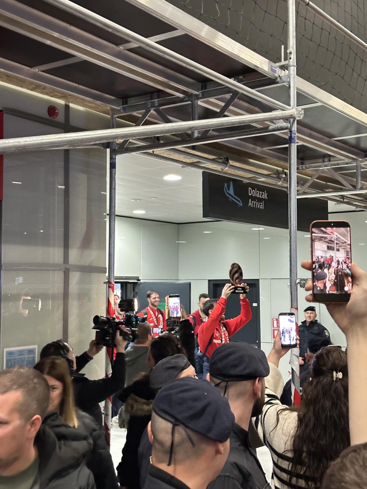 Reprezentacija je iz Danske sletjela iza 3:00 sata ujutro, a stotine navijača opremljenih zastavama i dresovima priredilo je doček za pamćenje. Prostorom su odjekivali hitovi Marka Perkovića Thompsona, Prljavog kazališta i Jure Stublića, dok su igrači dočekani ovacijama uz pjesmu „Ako ne znaš šta je bilo“.