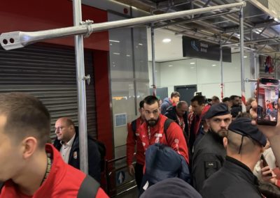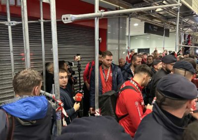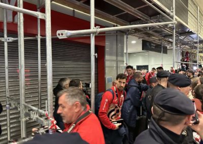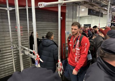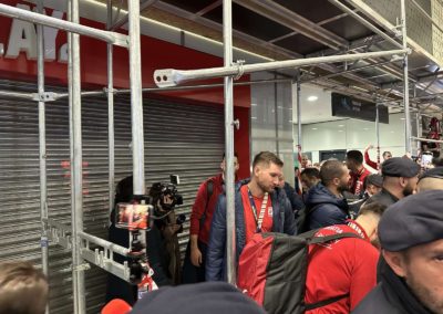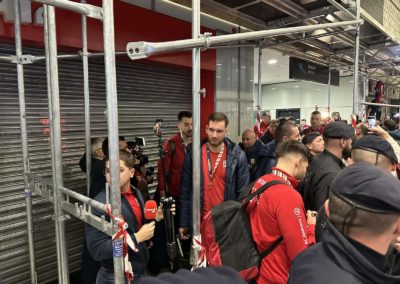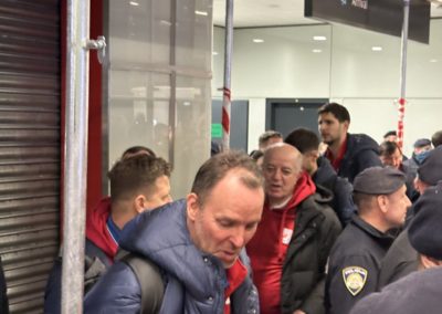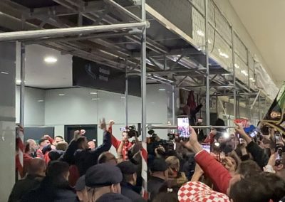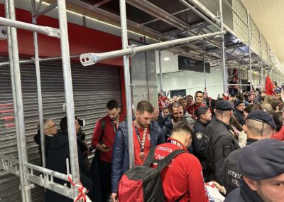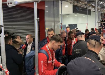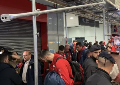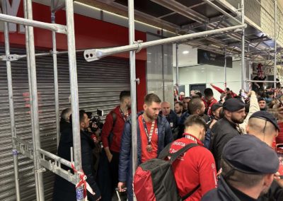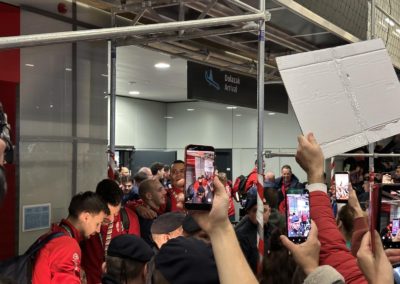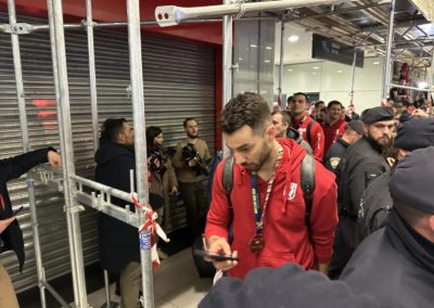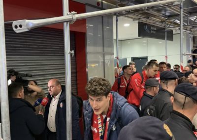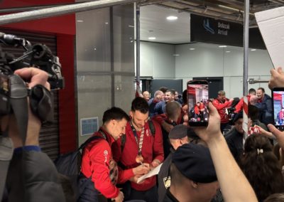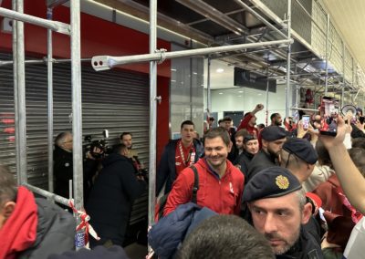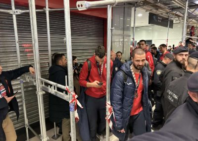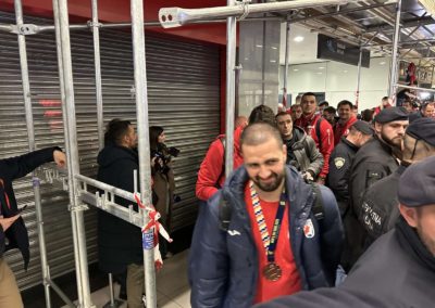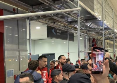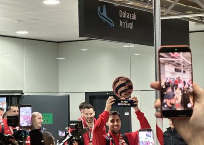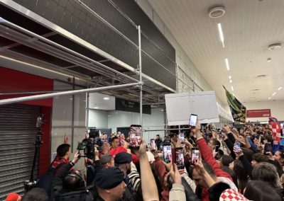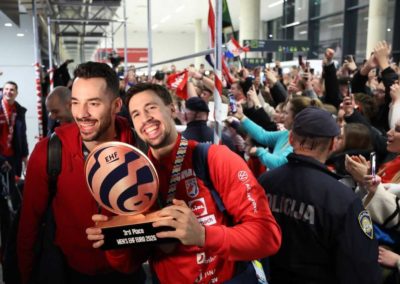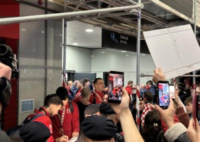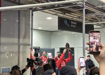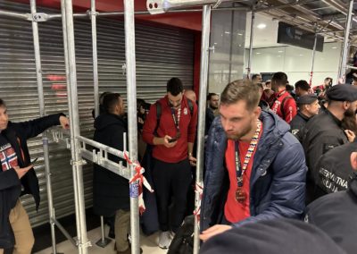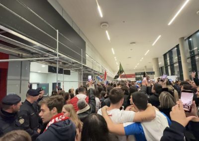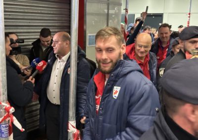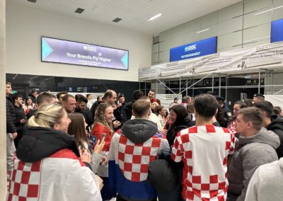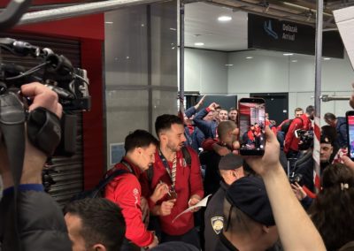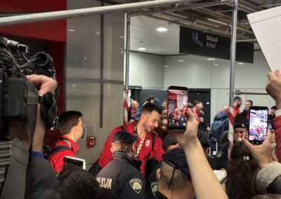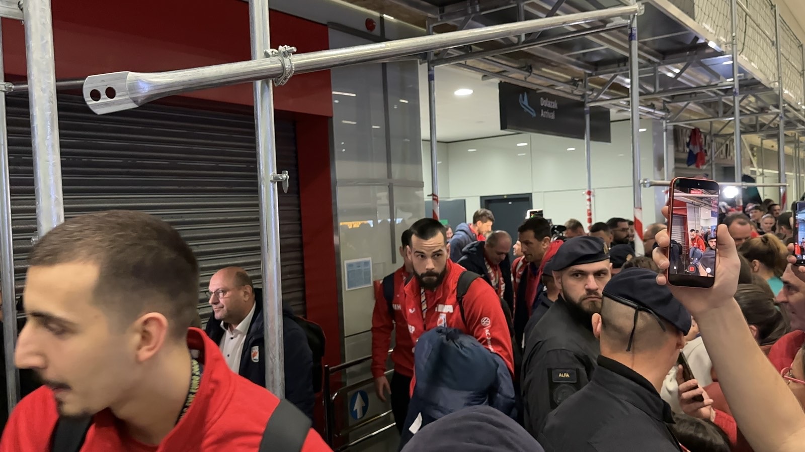 Reprezentacija je iz Danske sletjela iza 3:00 sata ujutro, a stotine navijača opremljenih zastavama i dresovima priredilo je doček za pamćenje. Prostorom su odjekivali hitovi Marka Perkovića Thompsona, Prljavog kazališta i Jure Stublića, dok su igrači dočekani ovacijama uz pjesmu „Ako ne znaš šta je bilo“.