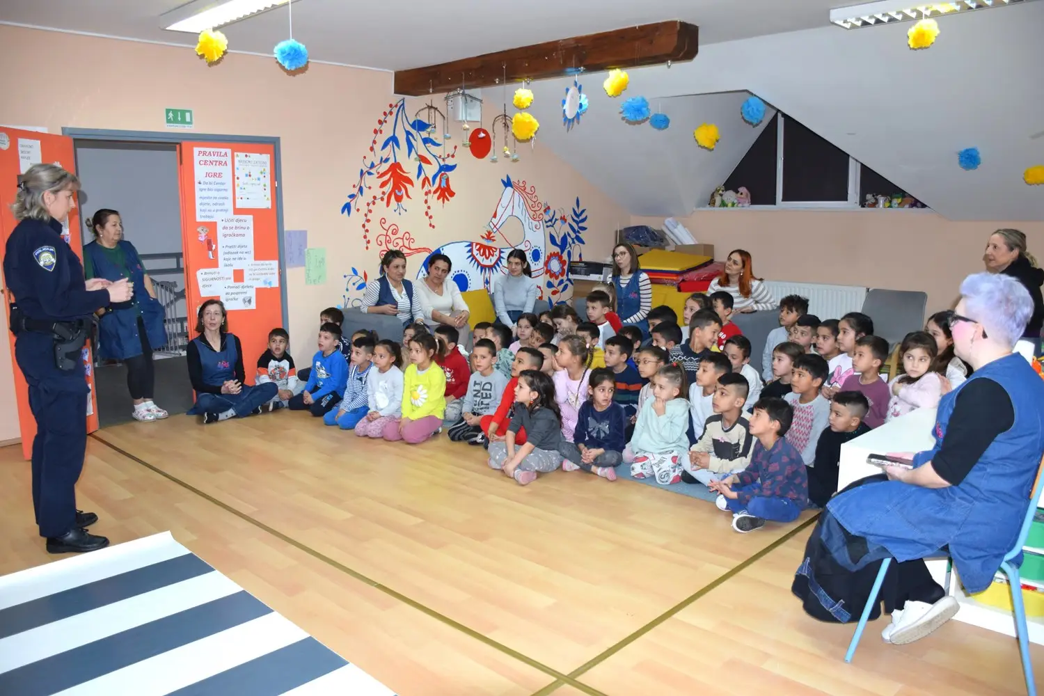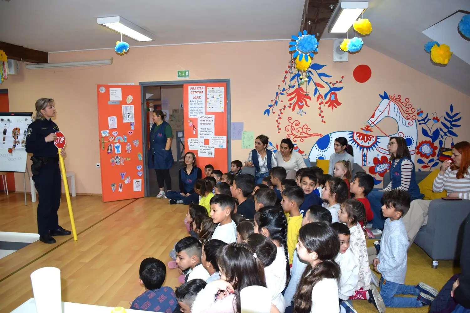 Akcija je započela interaktivnim predavanjem tijekom kojeg su djeca, na njima prilagođen i razumljiv način, upoznata s osnovnim pravilima ponašanja u prometu – kako pravilno prijeći cestu, što znače svjetla na semaforu, kako se sigurno voziti u automobilu, te zašto je važno uvijek biti pažljiv sudionik u prometu. Poseban naglasak stavljen je na prepoznavanje osnovnih prometnih znakova, poput znaka za pješački prijelaz, pješačku stazu, biciklističku stazu i znaka „STOP“.