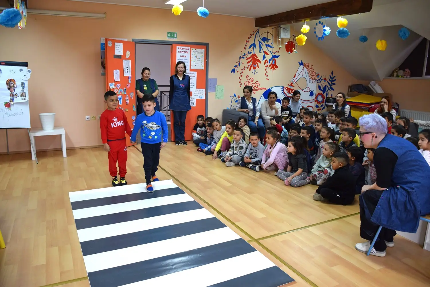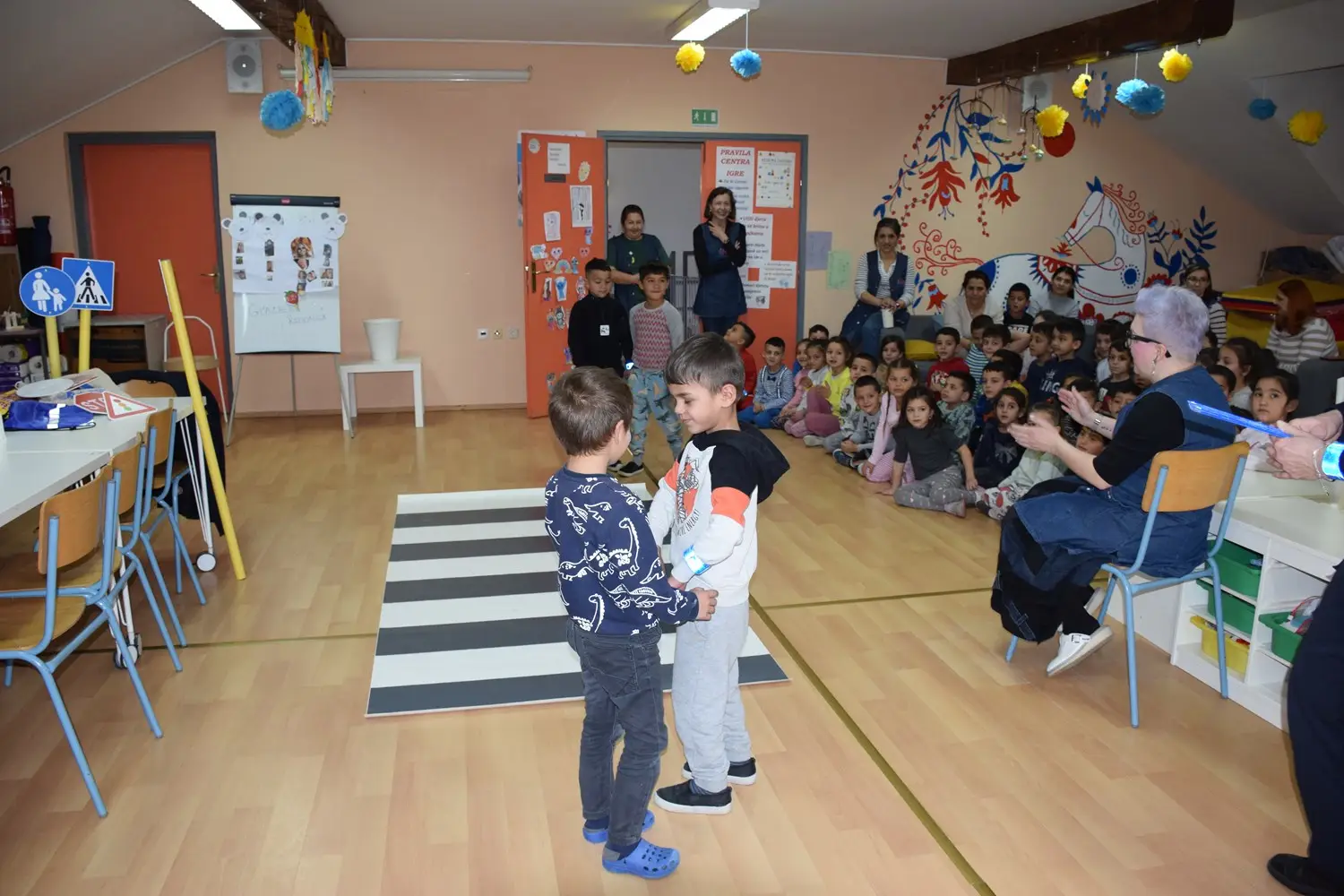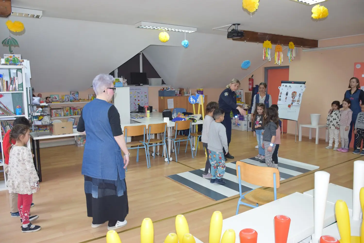 Kako bi stečeno teorijsko znanje primijenili u praksi, u dvorani vrtića izrađen je mali prometni poligon s označenim pješačkim prijelazom i postavljenim prometnim znakovima. Djeca su se podijelila u nekoliko skupina te su kroz igru i simulaciju prometnih situacija uvježbavala pravilno i sigurno kretanje. Poligon je izazvao veliko oduševljenje među mališanima, a djeca su s veseljem promatrala i bodrila svoje vršnjake.