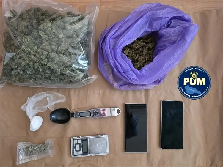 Policijski očevid rezultirao je pronalaskom tri paketa ispunjena zelenom biljnom materijom za koju je preliminarnim testiranjem utvrđeno da je marihuana, ukupne mase 588,69 grama. Uz to, pronađena je i vrećica s bijelom grumenastom tvari koja je pozitivno reagirala na kokain, mase 23,07 grama. Osim same droge, istražitelji su zaplijenili i predmete koji izravno ukazuju na namjeru prodaje: dvije digitalne vage za precizno mjerenje, dva mobilna uređaja koji su služili za komunikaciju te novčani iznos od 1.350,00 eura, za koji se sumnja da potječe od kriminalnih aktivnosti.