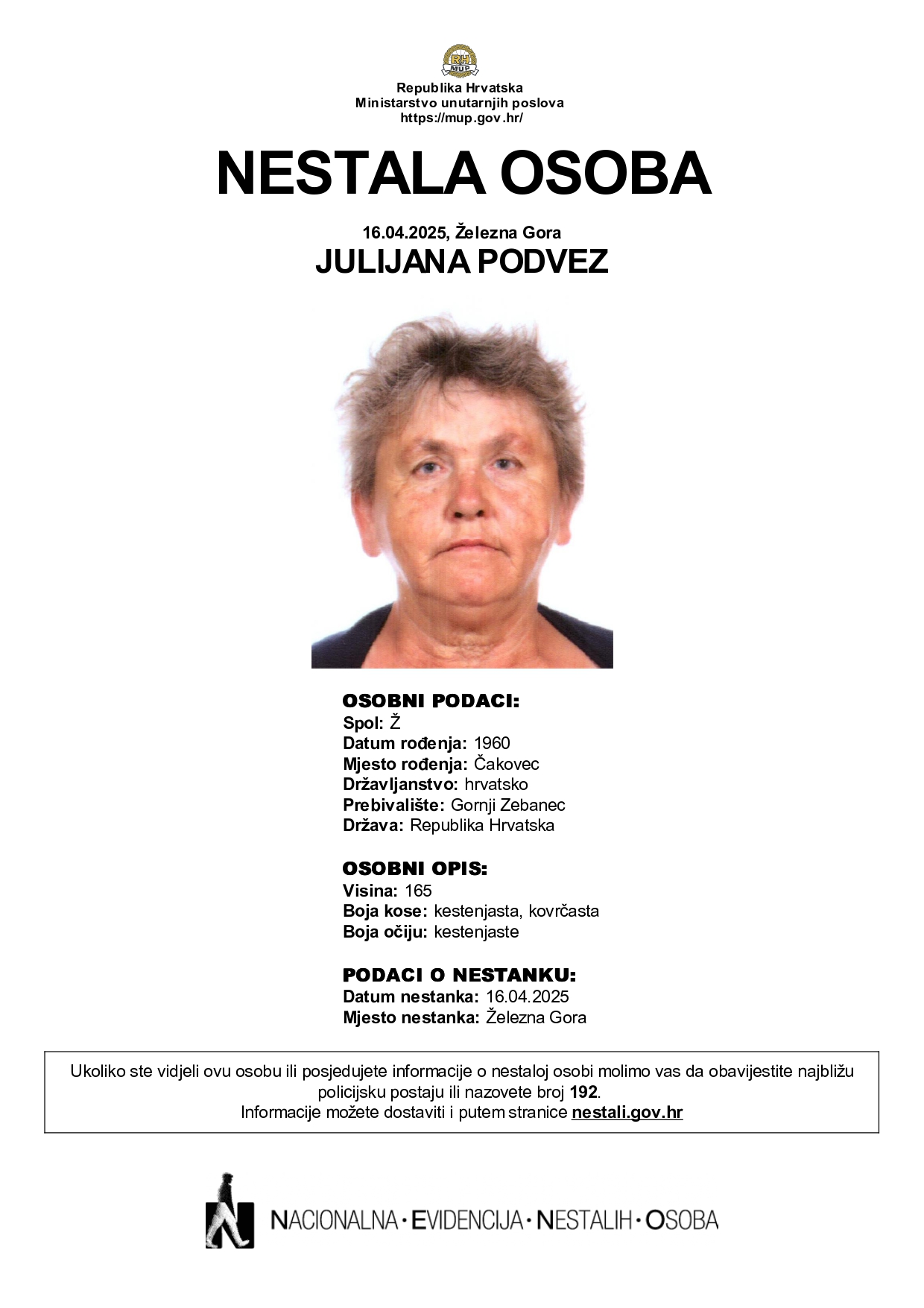 Policijski službenici Policijske uprave međimurske, u suradnji s pripadnicima Hrvatske gorske službe spašavanja (HGSS) i Dobrovoljnog vatrogasnog društva (DVD) Železna Gora, aktivno tragaju za nestalom Julijanom Podvez čiji je nestanak službeno prijavljen u srijedu, 16. travnja. Informacija o nestanku Julijane Podvez objavljena je i na internetskim stranicama Nacionalne evidencije nestalih osoba (NENO).