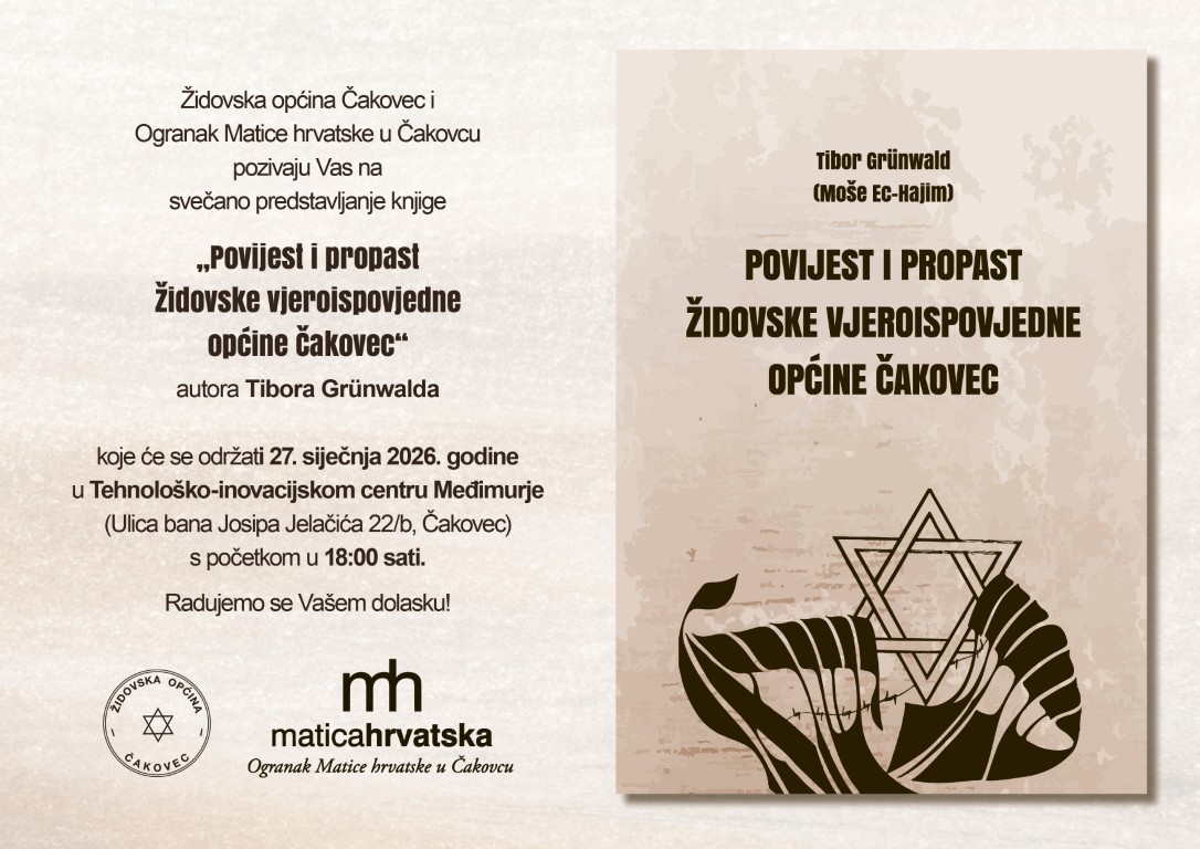 Povodom Međunarodnog dana sjećanja na žrtve Holokausta, u Čakovcu će se održati iznimno važan kulturni i povijesni događaj. Židovska općina Čakovec i Ogranak Matice hrvatske u Čakovcu u utorak, 27. siječnja 2026. godine, s početkom u 18:00 sati, predstavit će knjigu autora Tibora Grünwalda pod naslovom „Povijest i propast Židovske vjeroispovjedne općine Čakovec“. Svečanost će se upriličiti u prostorima Tehnološko-inovacijskog centra Međimurje (TICM).