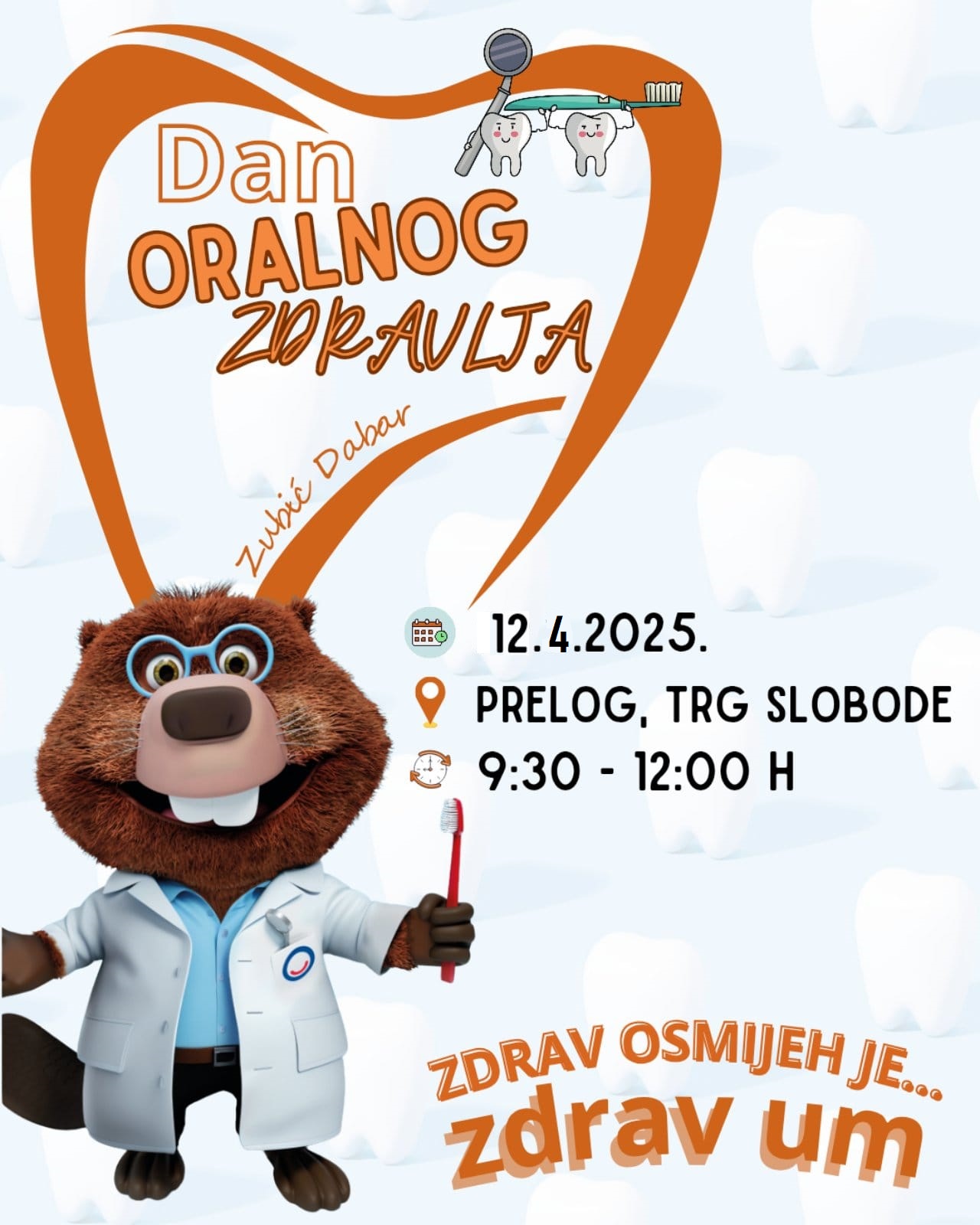 U subotu, 12. travnja 2025., od 9:30 do 12 sati, na Trgu Slobode u Prelogu, Hrvatsko stomatološko društvo HLZ-a Čakovec (međimurski stomatolozi) i Društvo “Naša djeca” Prelog obilježit će Svjetski dan oralnog zdravlja (koji se inače obilježava 20. ožujka svake godine).