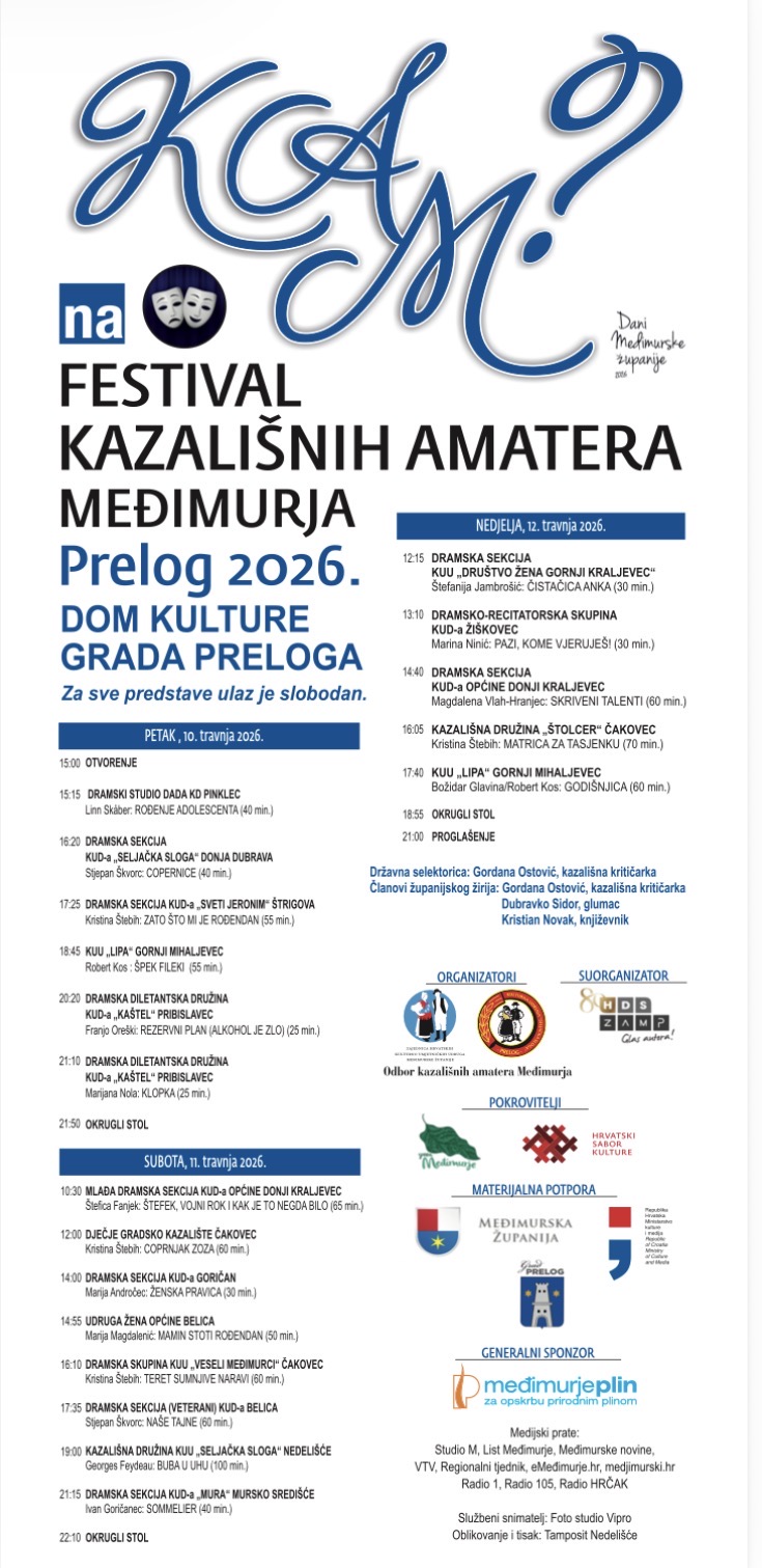 Dom kulture Grada Preloga ugostit će od 10. do 12. travnja Festival kazališnih amatera Međimurja (KAM). Tijekom tri dana bogatog programa, publika će moći uživati u čak 18 predstava, a ulaz na sve izvedbe je besplatan.