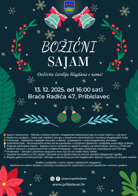 Pribislavec se priprema za najljepši dio godine, pozivajući sve mještane i posjetitelje da dožive istinsku čaroliju blagdana na tradicionalnom Božićnom sajmu. Sajam će se održati u subotu, 13. prosinca 2025., s početkom u 16:00 sati, na adresi Braće Radića 47 u Pribislavcu.