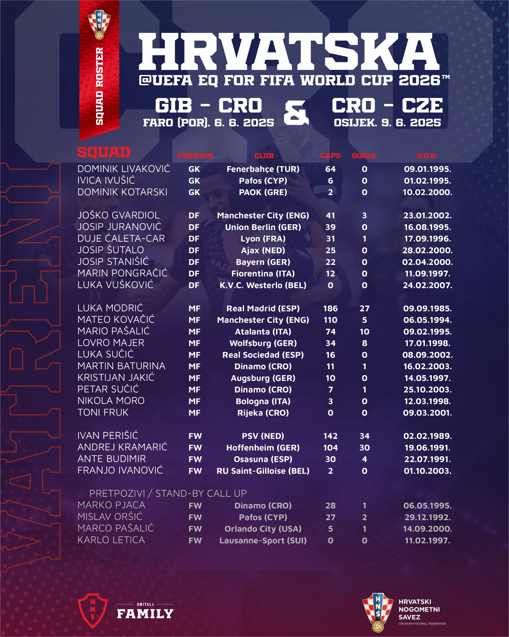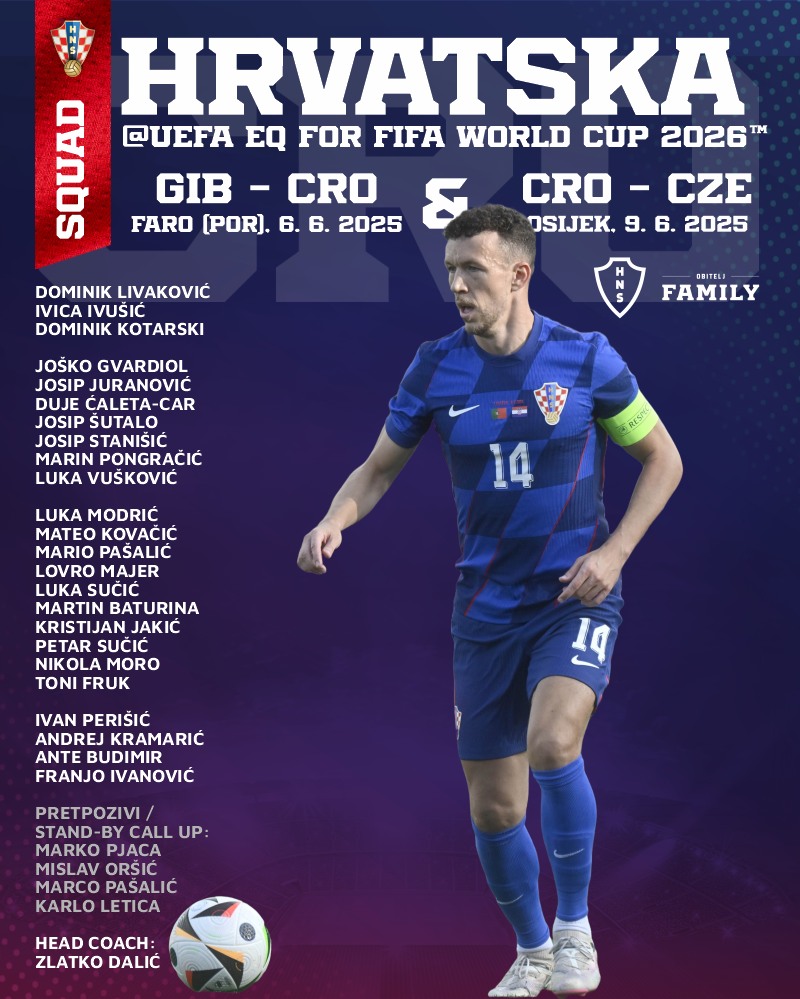 Nakon što je u ožujku nakon jedanaesteraca protiv Francuske završila natjecanje u Ligi nacija, hrvatska reprezentacija u lipnju započinje svoj kvalifikacijski put prema Svjetskom prvenstvu 2026. godine. Vatrene 6. lipnja očekuje ogled s Gibraltarom u portugalskom Faru (20:45), a tri dana kasnije Hrvatska će dočekati Češku na Opus Areni u Osijeku (20:45).