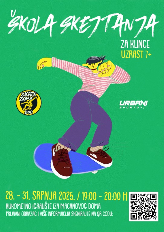 Želite li da vaše dijete nauči osnove skejtanja ili usavrši postojeće vještine pod vodstvom iskusnih instruktora? Prijavite se jednostavno! Sve što trebate je skenirati QR kod na plakatu i ispuniti prijavnicu.