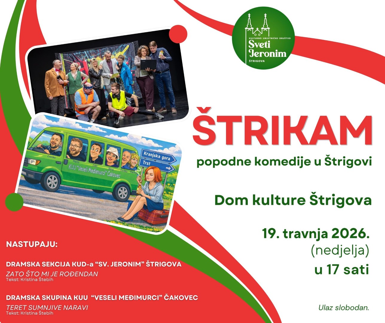 Program otvara Dramska sekcija KUD-a „Sv. Jeronim“ Štrigova s predstavom naslovljenom „Zato što mi je rođendan“. Riječ je o komadu koji na duhovit način progovara o svakodnevnim situacijama i međuljudskim odnosima, a domaća publika s nestrpljenjem očekuje nastup svojih mještana koji su poznati po izvrsnoj energiji na sceni. Nakon njih, na pozornicu stupa Dramska skupina KUU-e „Veseli Međimurci“ Čakovec koja će izvesti predstavu „Teret sumnjive naravi“. Ova komedija situacije obećava brojne zaplete i salve smijeha, potvrđujući status čakovečke skupine kao jedne od najaktivnijih u županiji.