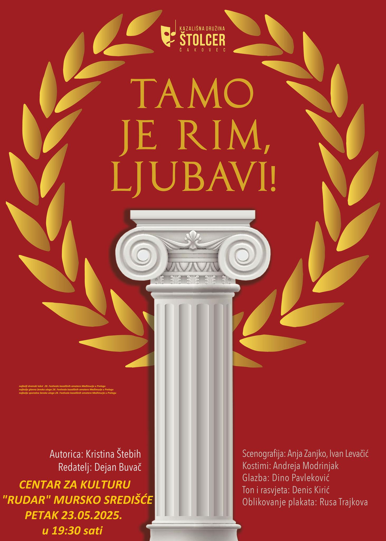 Ne propustite jedinstvenu priliku da večeras zavirite u davnu prošlost Međimurja! Kazališna družina Štolcer iz Čakovca izvest će svoju hit predstavu “Tamo je Rim, ljubavi!” u Centru za kulturu „Rudar“. Predstava počinje u 19:30 sati, a ulaznice po cijeni od 5,00 eura možete kupiti na blagajni prije početka.
