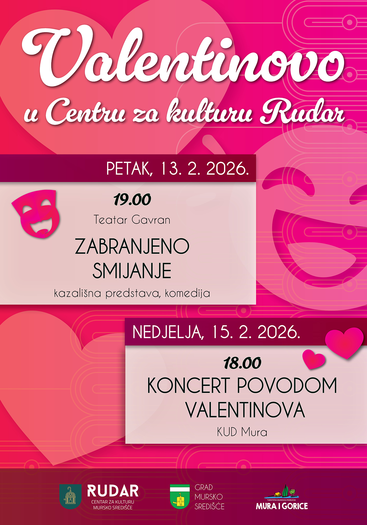 Slavlje ljubavi nastavlja se u nedjelju, 15. veljače u 18:00 sati, tradicionalnim Koncertom za Valentinovo u izvedbi KUD-a Mura. Posjetitelji će moći uživati u emotivnoj glazbenoj večeri prožetoj međimurskom popevkom i dalmatinskom klapskom romantikom. Za nezaboravnu atmosferu pobrinut će se Mješoviti pjevački zbor i Klapa KUD-a Mura, uz vokalne izvedbe solistica Vitomire Turk i Nikol Kutnjak. Posebno vrijedi istaknuti kako je ulaz na koncert potpuno slobodan, što je idealna prilika za sve generacije da uživaju u zajedništvu i ljepoti glazbe.
