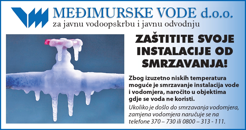 Zbog najavljenih izuzetno niskih temperatura, Međimurske vode d.o.o. uputile su apel svim korisnicima javne vodoopskrbe da hitno poduzmu mjere zaštite svojih vodovodnih instalacija. Posebno se naglašava opasnost od smrzavanja u objektima koji se ne koriste svakodnevno, poput vikendica ili kuća u izgradnji, gdje voda miruje u cijevima. Kako bi se izbjegle znatne materijalne štete i prekidi u opskrbi, nužno je adekvatno izolirati vodomjerna okna i izložene dijelove sustava koji se nalaze izvan grijanih prostora.