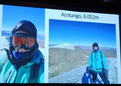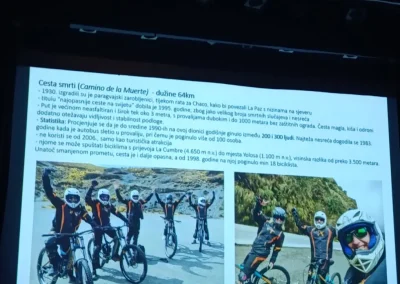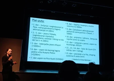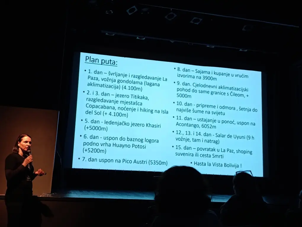Kroz niz upečatljivih fotografija i bogatih osobnih iskustava, Tanja je publiku provela kroz ljepote bolivijskih Anda. Putovanje je započelo u fascinantnom visinskom gradu La Paz, nastavilo se posjetom mističnom jezeru Titicaca i otoku Isla del Sol, a kulminiralo je prolaskom kroz nestvarne pejzaže Salar de Uyunija, najveće slane pustinje na svijetu. Osim vizualnih ljepota, poseban naglasak stavljen je na izazovne planinarske uspone na vrhove Anda, poput Pico Austrije i Acotanga, te na adrenalinski spust biciklima opasnom i legendarnom cestom poznatom kao Yungas Road.