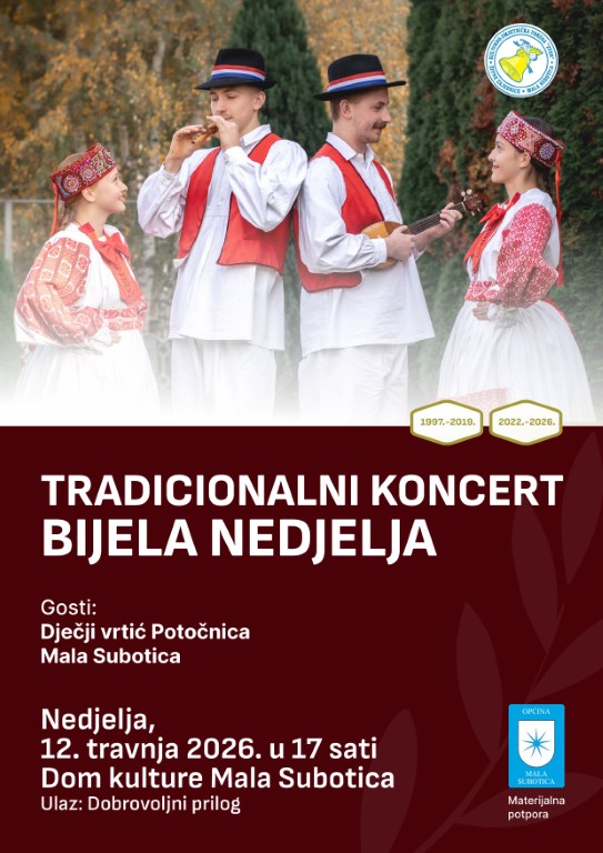 Kulturno-umjetnička udruga “Zvon” župne zajednice Mala Subotica poziva sve mještane i ljubitelje tradicije na svoj tradicionalni godišnji koncert pod nazivom „Bijela nedjelja“. Ovogodišnje izdanje ima poseban značaj jer udruga obilježava 30 godina uspješnog djelovanja u očuvanju međimurske baštine.