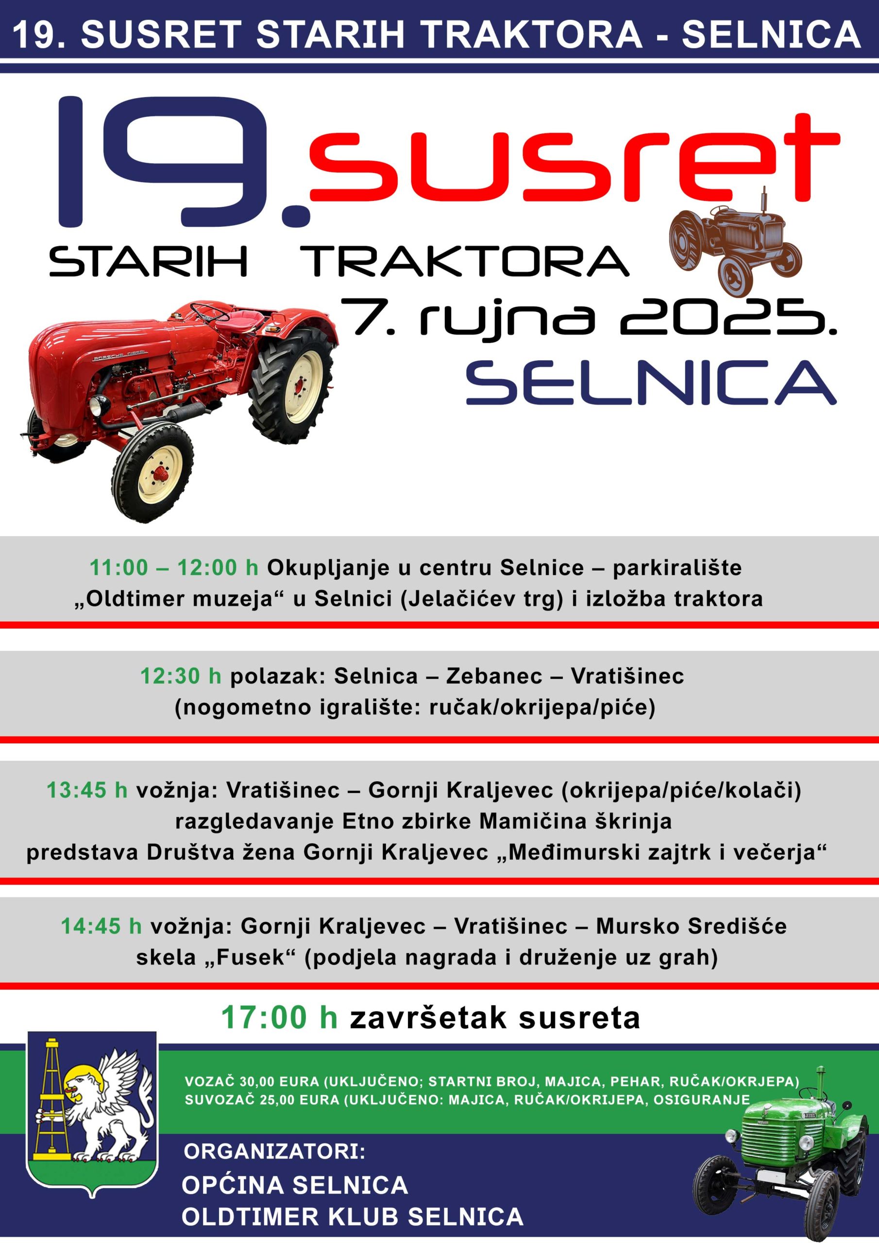 Program počinje u 11 sati okupljanjem u centru Selnice, na parkiralištu Oldtimer muzeja u Jelačićevom trgu, gdje će se održati i izložba svih sudionika. U 12:30 kreće defile traktorima, na putovanje koje će vozače i posjetitelje provesti kroz neke od najljepših dijelova Međimurja: