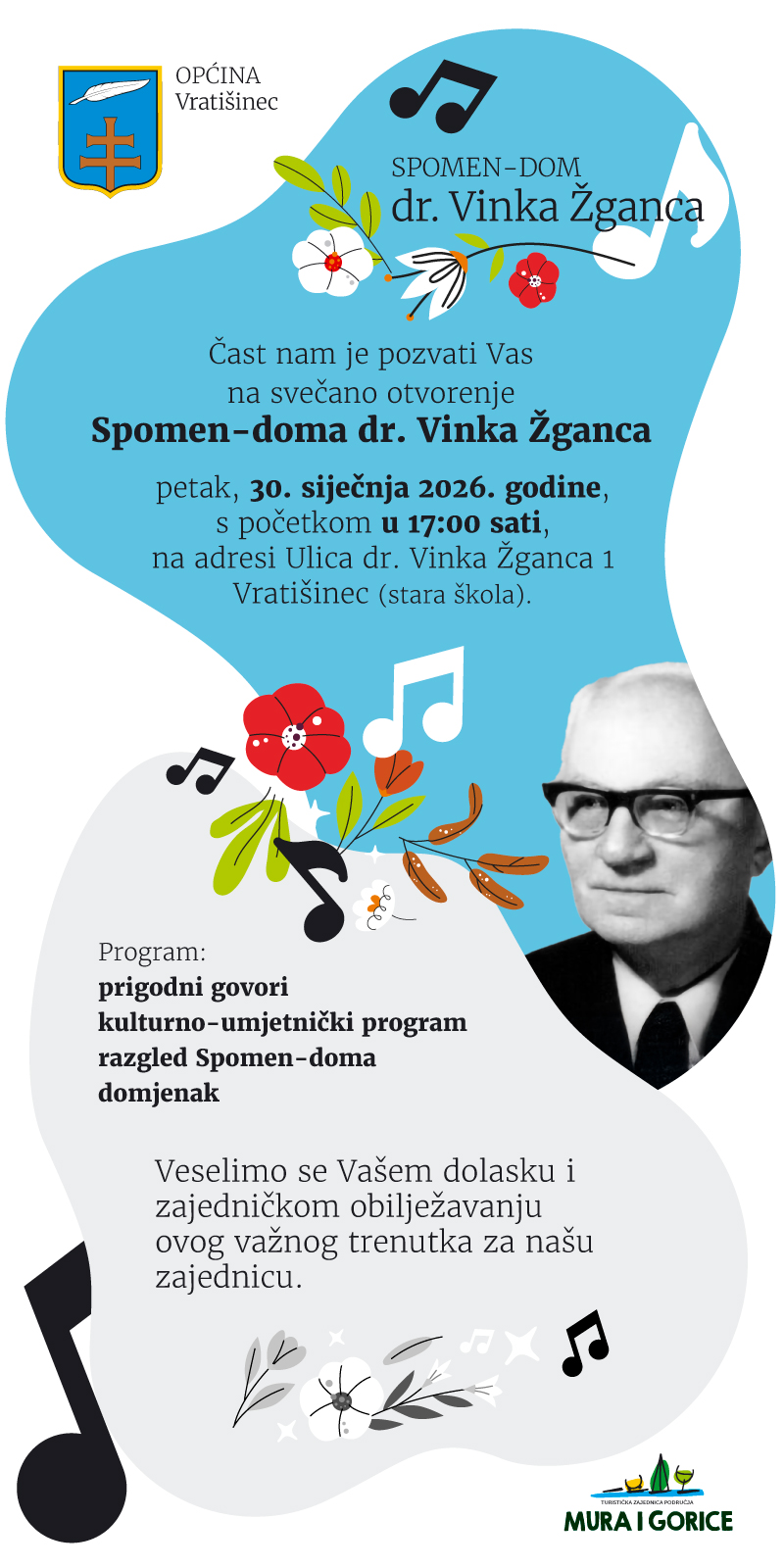 U četvrtak, 30. siječnja u 17:00 sati, u sklopu Noći muzeja, svečano će biti otvoren Spomen-dom dr. Vinka Žganca. Ovaj jedinstveni projekt, nastao suradnjom Općine Vratišinec i TZ područja „Mura i gorice“, osmišljen je kao suvremeni interpretacijski centar posvećen životu i radu neumornog melografa, etnomuzikologa i zapisivača koji je spasio tisuće međimurskih napjeva od zaborava.